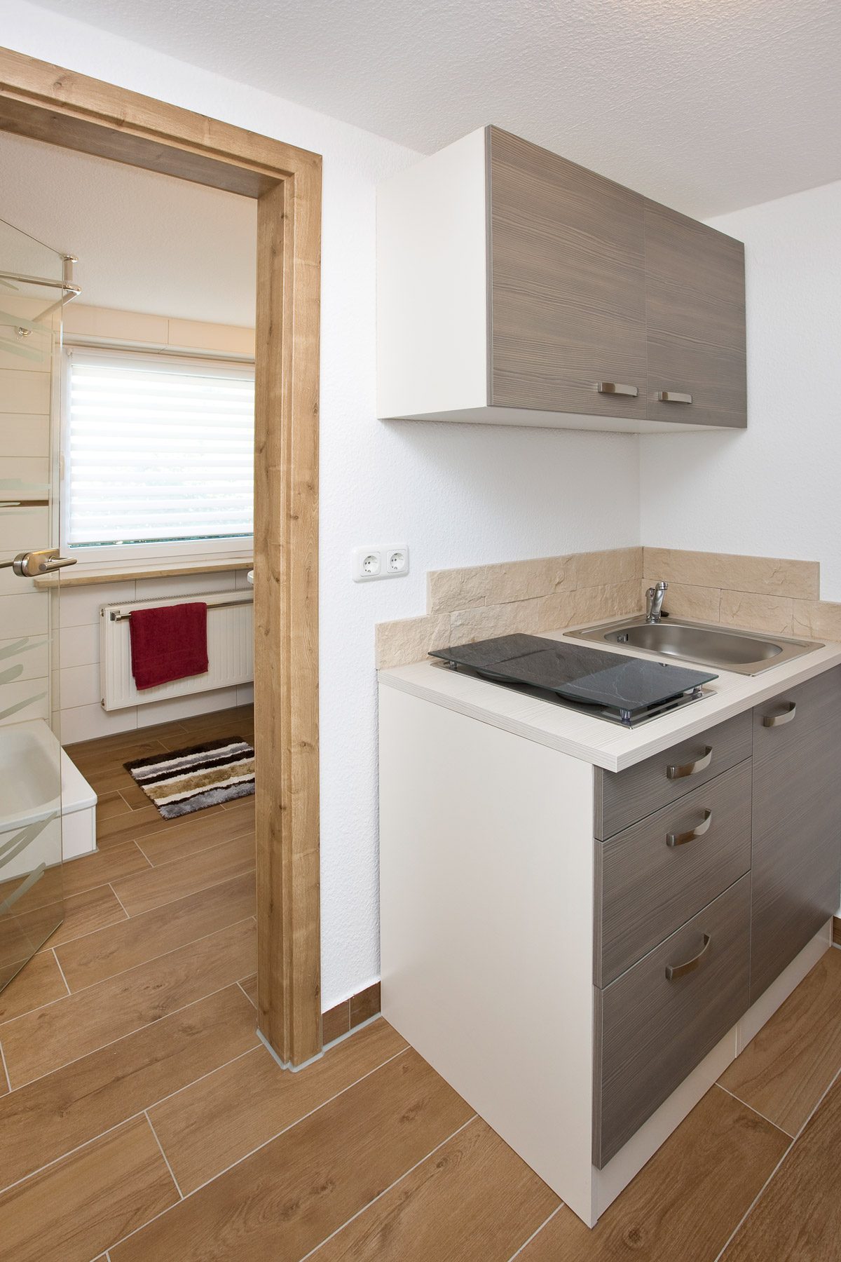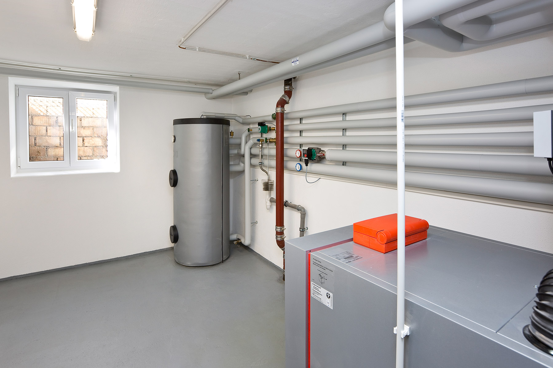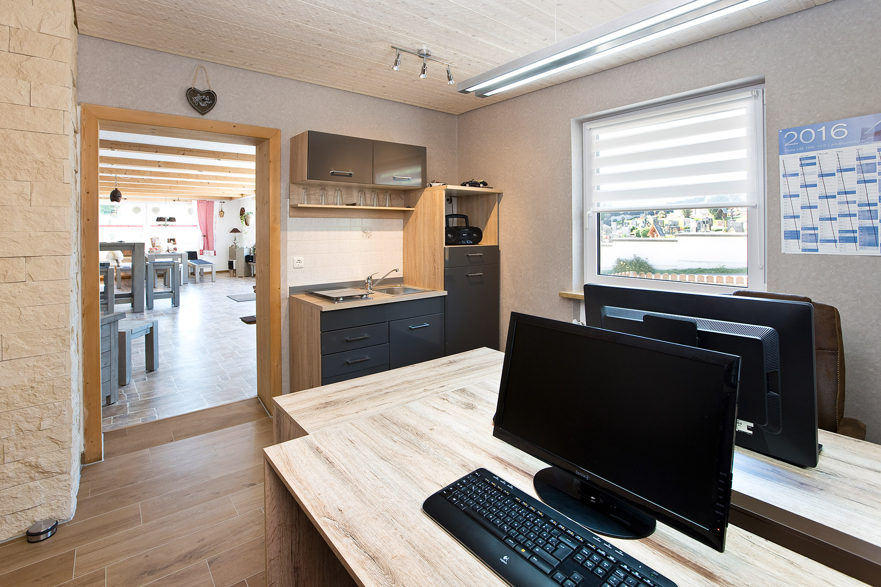 Das anschließende Büro, die Werkstatt und das Gäste-WC machen aus dem Erdgeschoss einen Gäste- und Arbeitsbereich, der keine Wünsche offen lässt. Wie ein roter Faden ziehen sich auch hier natürliche Materialien durch die Räume und verleihen ihnen eine elegante und zugleich wohnliche Ausstrahlung.