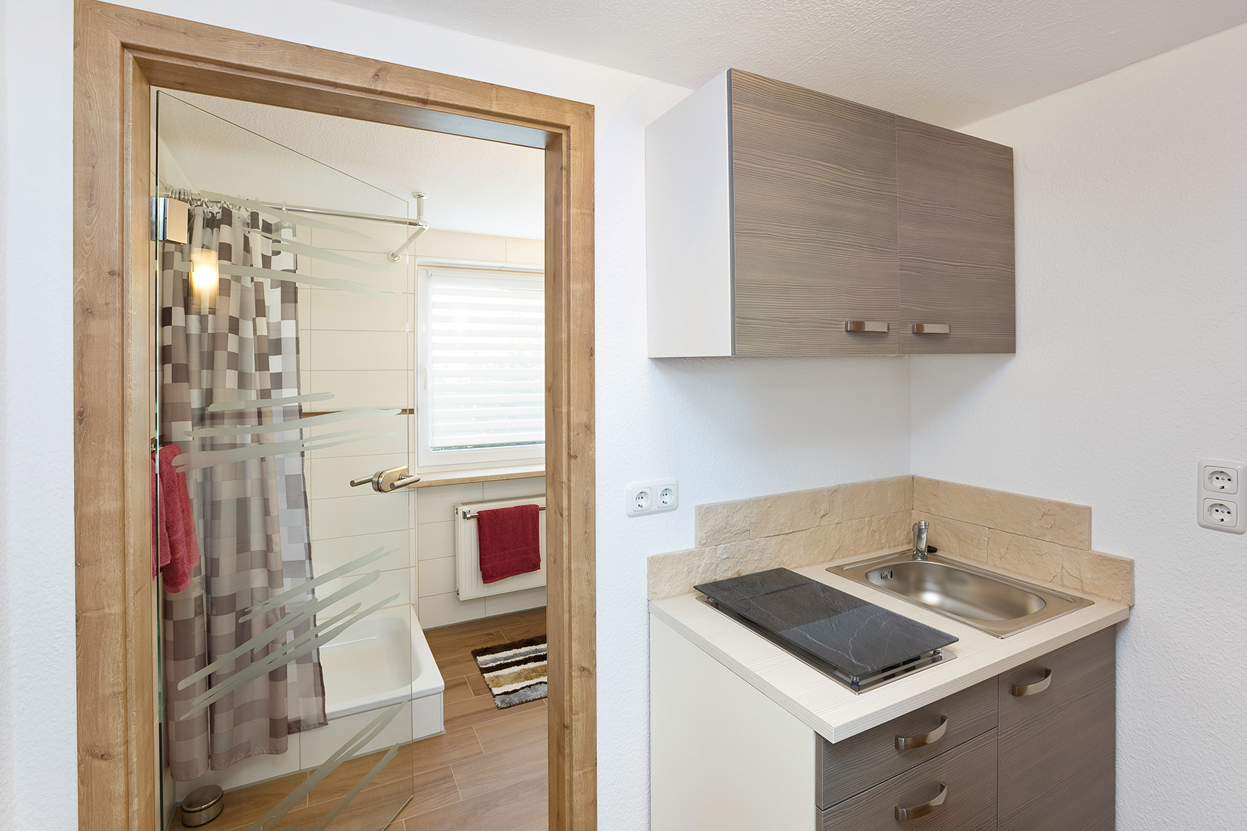 Von außen trägt das farblich neu gestaltete Gebäude wieder zu einem harmonischen Gesamtbild am Dorfplatz bei. Die weiße Fassade mit roten Fensterläden und farblich abgesetztem Sockel lassen in Kombination mit den Holzbalkonen das in die Jahre gekommene Gebäude wieder in neuem Glanz erstrahlen.