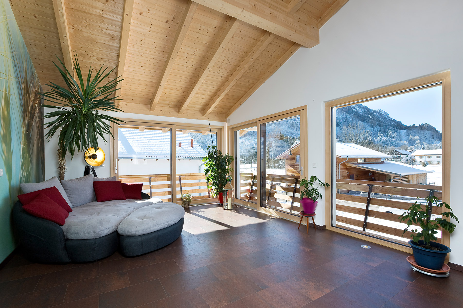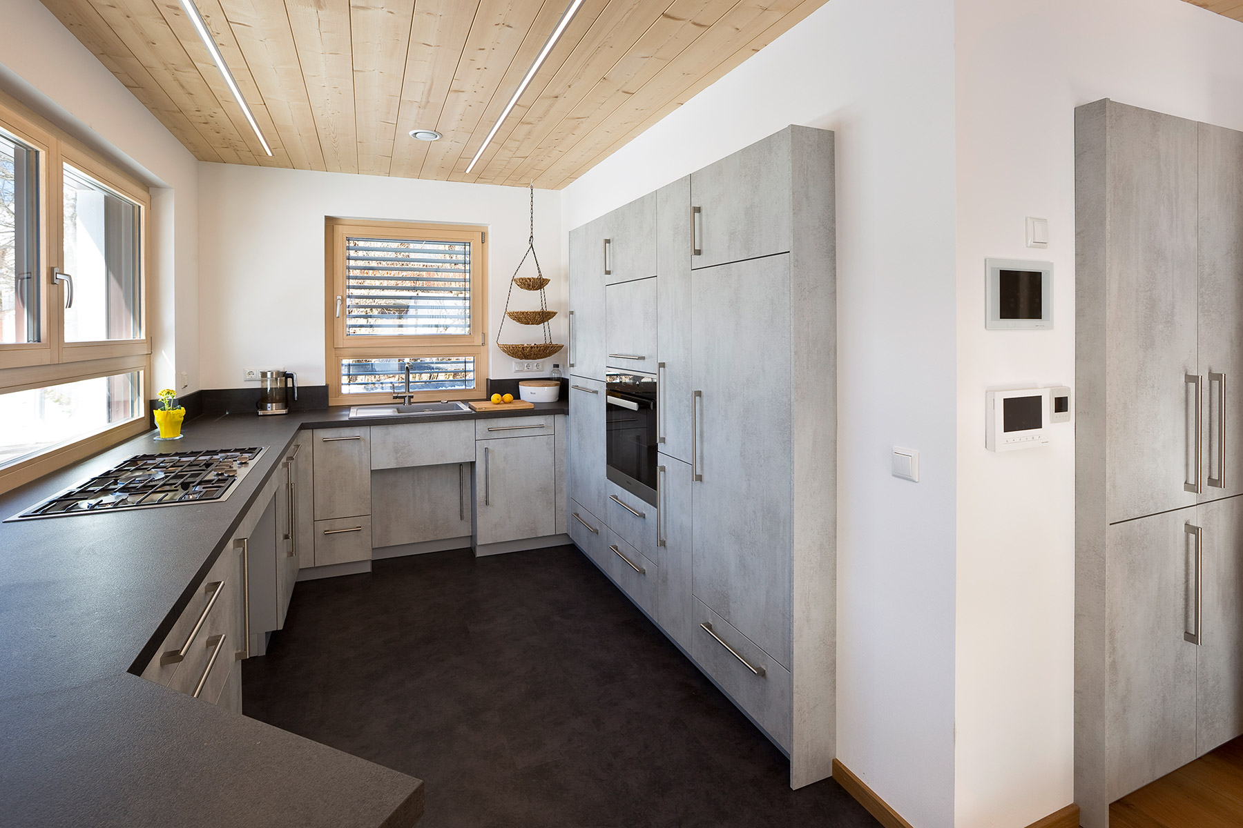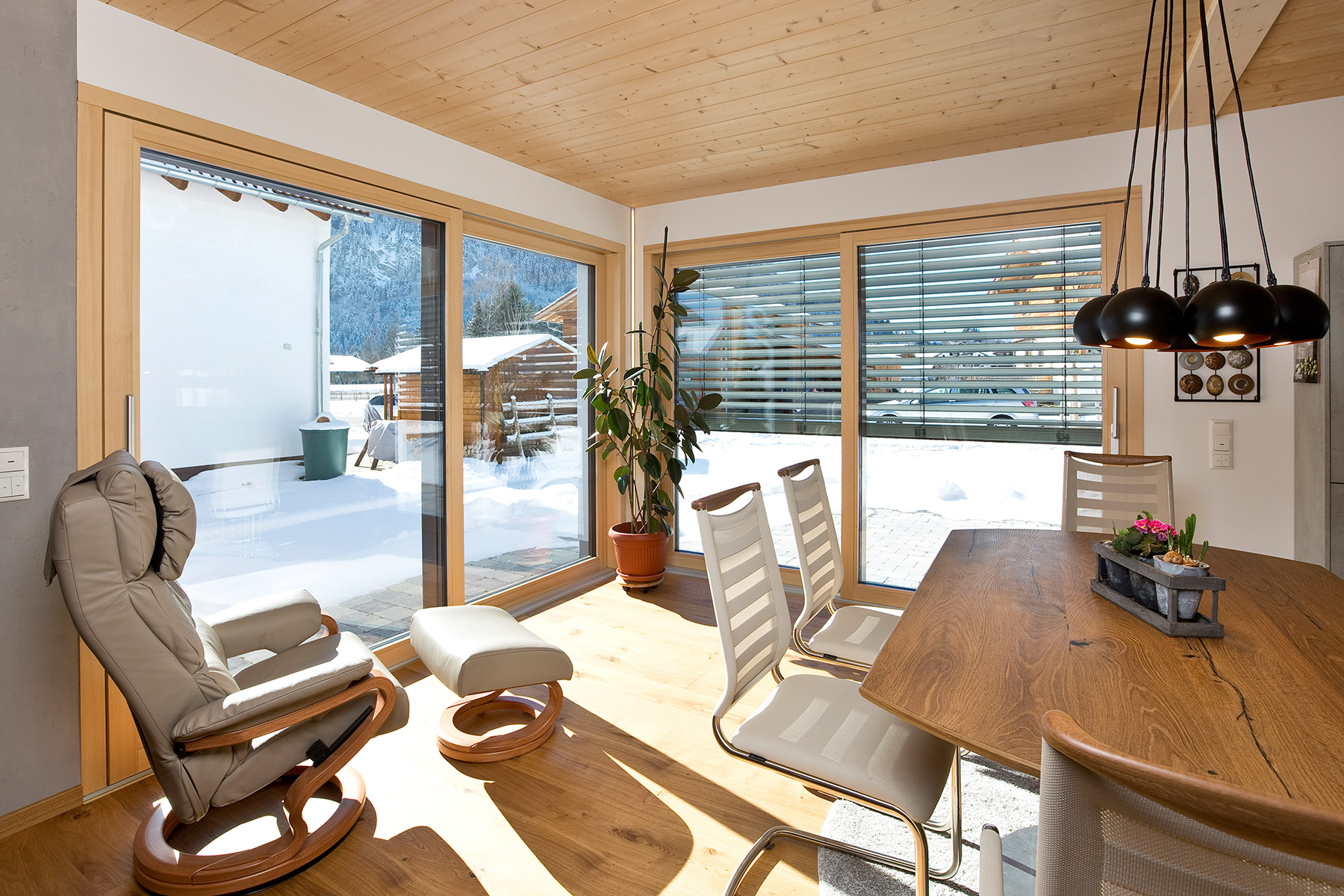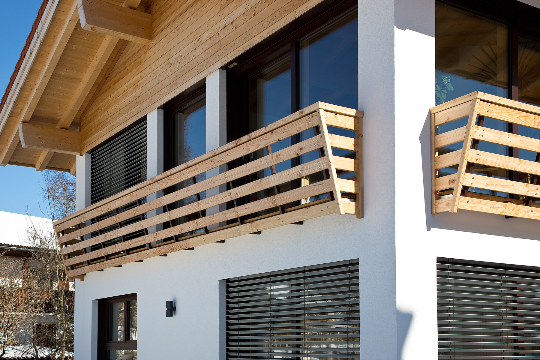 Das Wohnzimmer und die großzügige Küche mit stilvollem Essbereich sind offen und modern gestaltet. Durch geölte Holzbodenbeläge und eine schlichte Wandgestaltung entsteht eine angenehme Kombination aus Behaglichkeit und Eleganz der Räume. Außen runden die französischen Balkone im Holzlook, in Harmonie mit den moccafarbenen Gaulhofer Holz-Alu-Fenstern den eleganten Charakter des Hauses ab. Zusammen mit der, typisch für ein Hauser Holzhaus, exzellenten Gebäudehülle, gedämmt mit natürlicher Holzfaser, entstand ein neues KfW-40 Plus Effizienz-Einfamilienhaus zum Wohlfühlen.