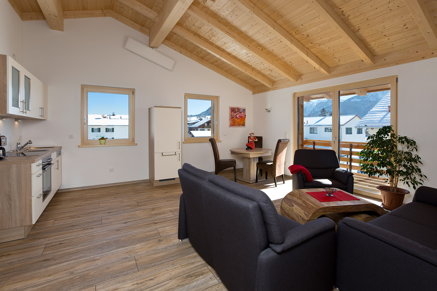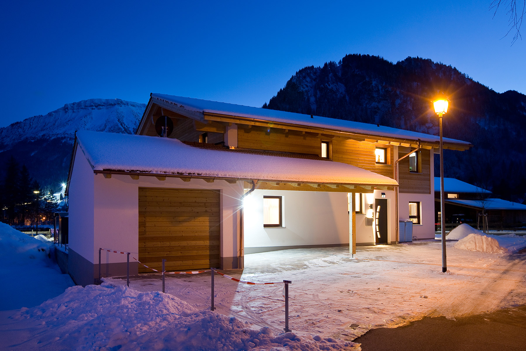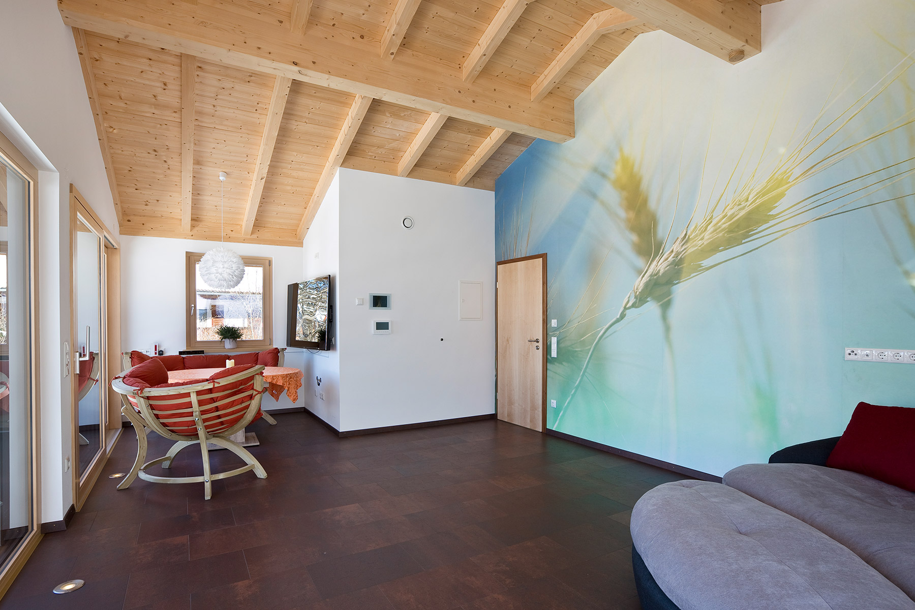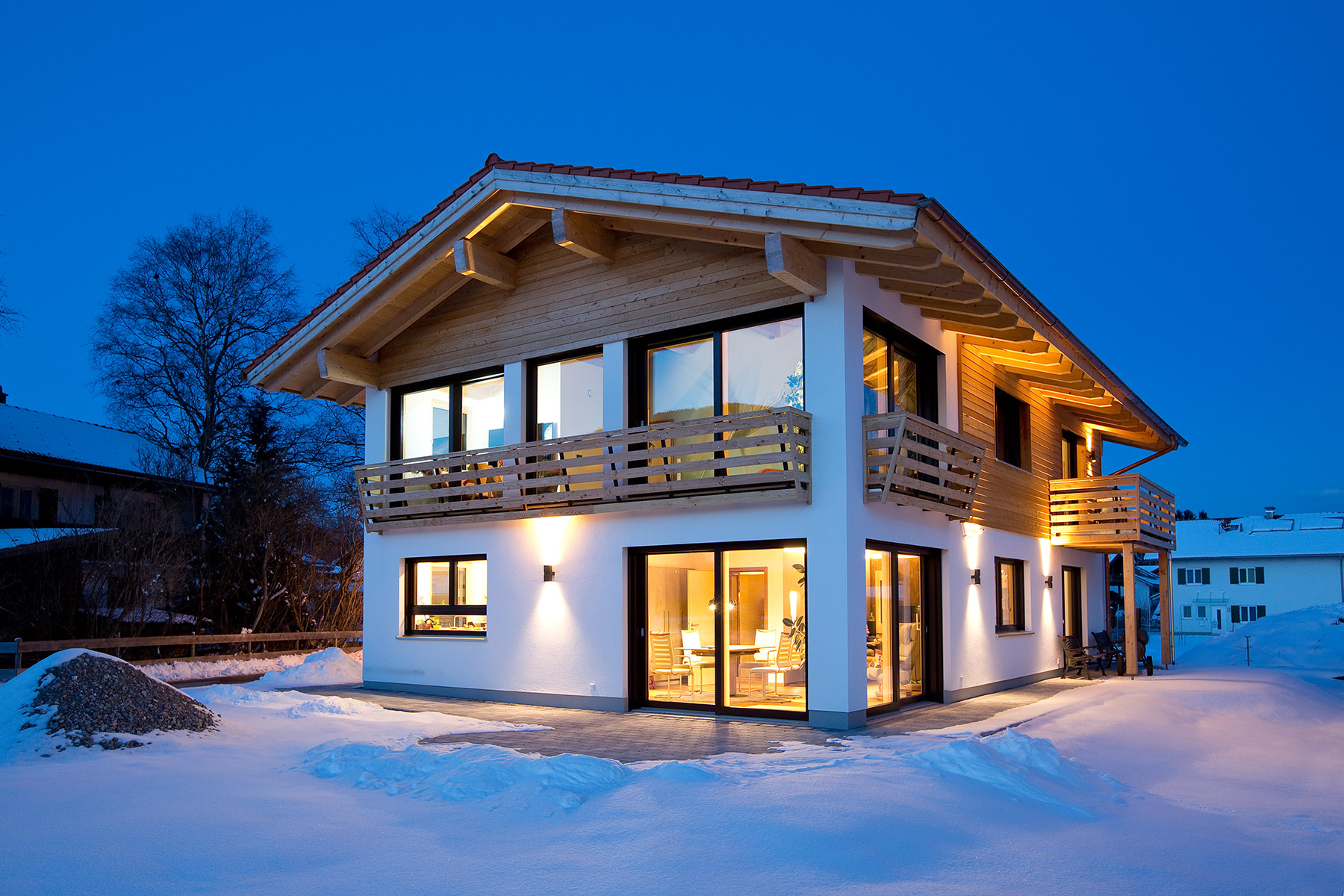 Das Wohnzimmer und die großzügige Küche mit stilvollem Essbereich sind offen und modern gestaltet. Durch geölte Holzbodenbeläge und eine schlichte Wandgestaltung entsteht eine angenehme Kombination aus Behaglichkeit und Eleganz der Räume. Außen runden die französischen Balkone im Holzlook, in Harmonie mit den moccafarbenen Gaulhofer Holz-Alu-Fenstern den eleganten Charakter des Hauses ab. Zusammen mit der, typisch für ein Hauser Holzhaus, exzellenten Gebäudehülle, gedämmt mit natürlicher Holzfaser, entstand ein neues KfW-40 Plus Effizienz-Einfamilienhaus zum Wohlfühlen.