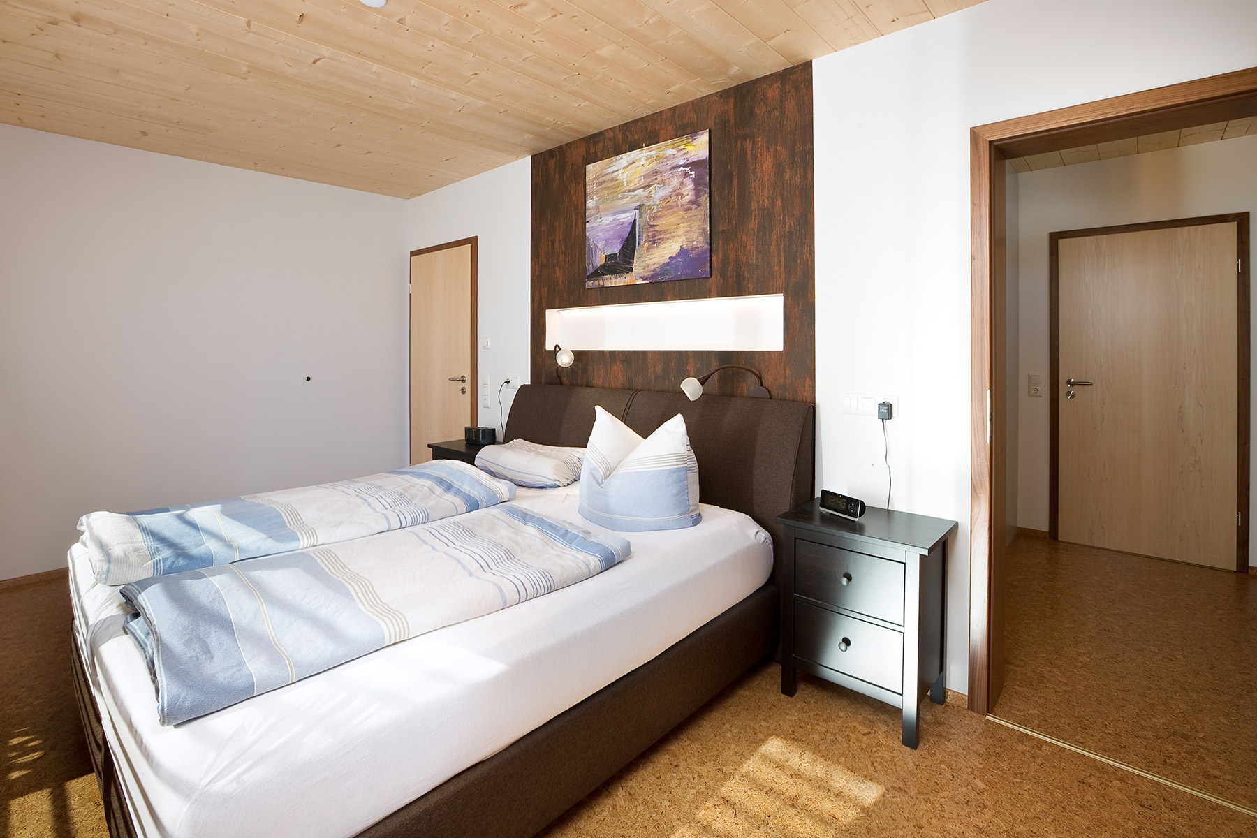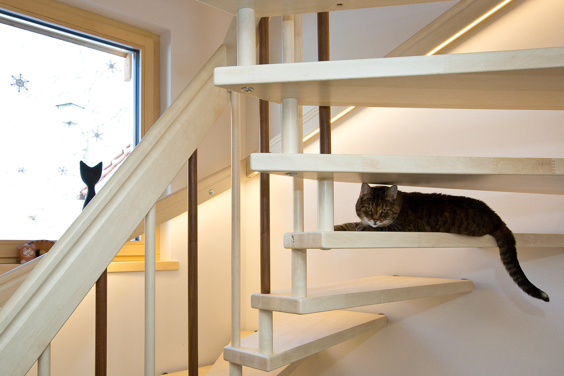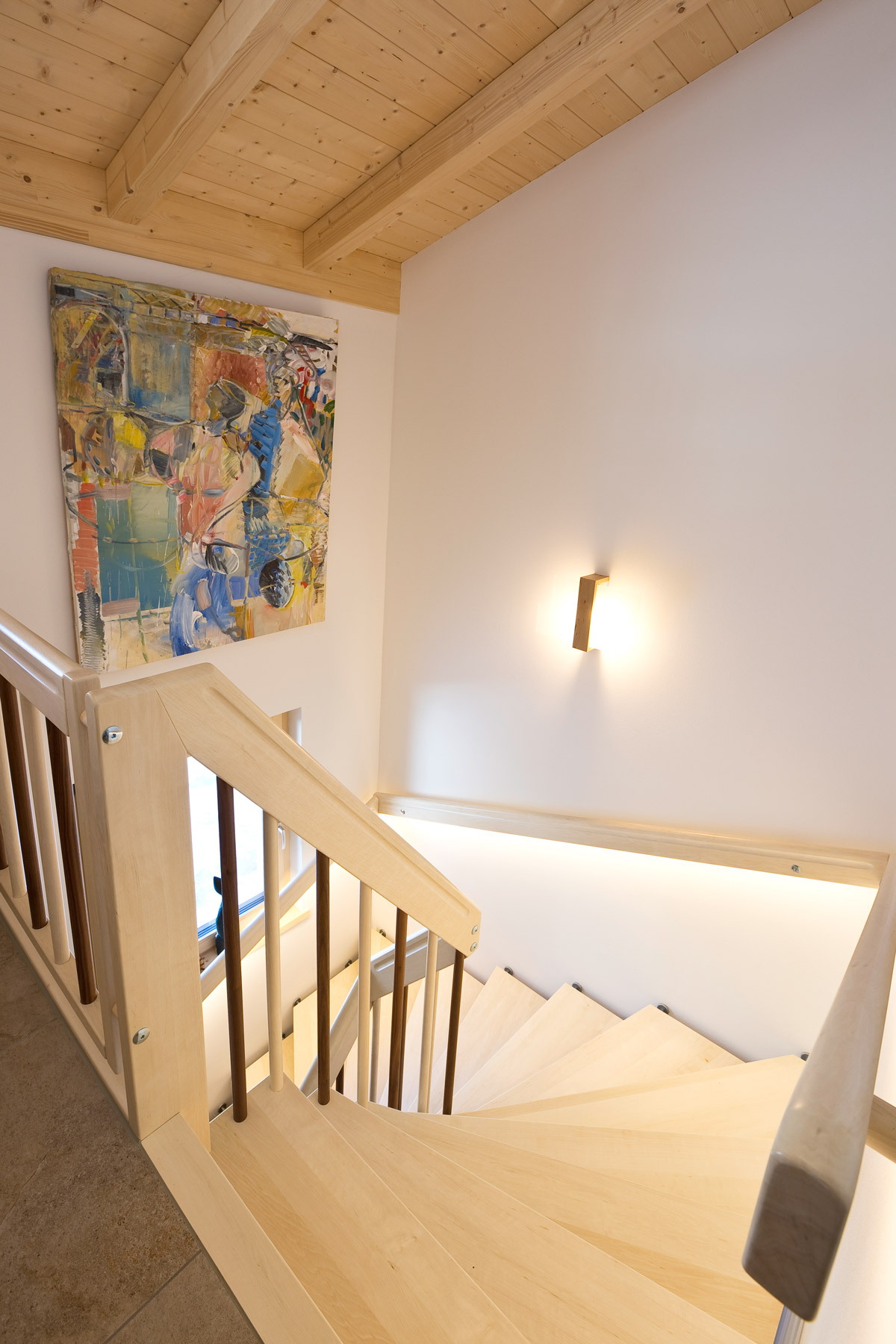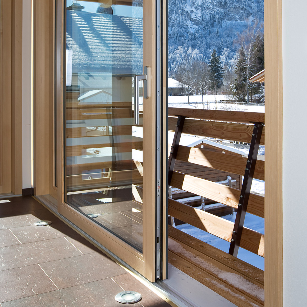 Das Wohnzimmer und die großzügige Küche mit stilvollem Essbereich sind offen und modern gestaltet. Durch geölte Holzbodenbeläge und eine schlichte Wandgestaltung entsteht eine angenehme Kombination aus Behaglichkeit und Eleganz der Räume. Außen runden die französischen Balkone im Holzlook, in Harmonie mit den moccafarbenen Gaulhofer Holz-Alu-Fenstern den eleganten Charakter des Hauses ab. Zusammen mit der, typisch für ein Hauser Holzhaus, exzellenten Gebäudehülle, gedämmt mit natürlicher Holzfaser, entstand ein neues KfW-40 Plus Effizienz-Einfamilienhaus zum Wohlfühlen.