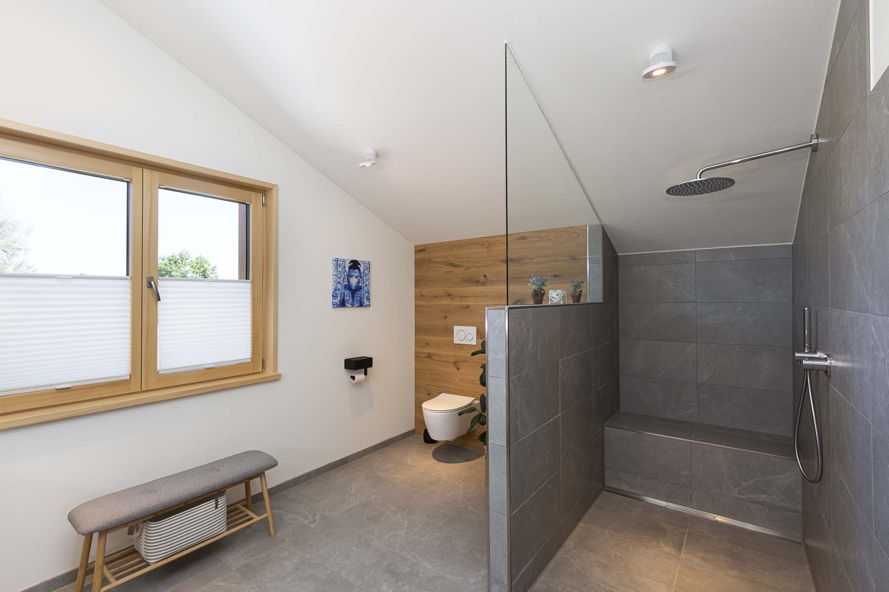 Das moderne Badezimmer ist mit hochwertigen Fliesen in grauer Betonoptik und warmem Holz gestaltet. Die bodengleiche Dusche mit Sitzfläche bietet nicht nur Komfort, sondern auch Sicherheit und Entspannung – ein Ort, an dem Sie die Seele baumeln lassen können.