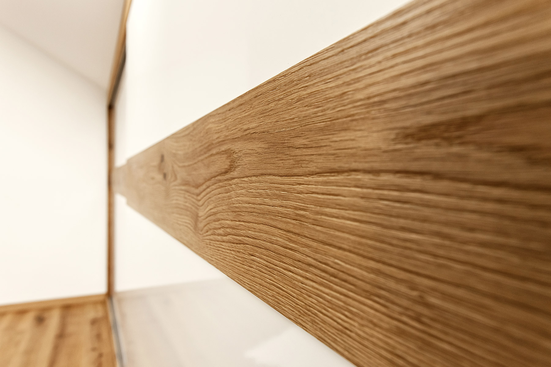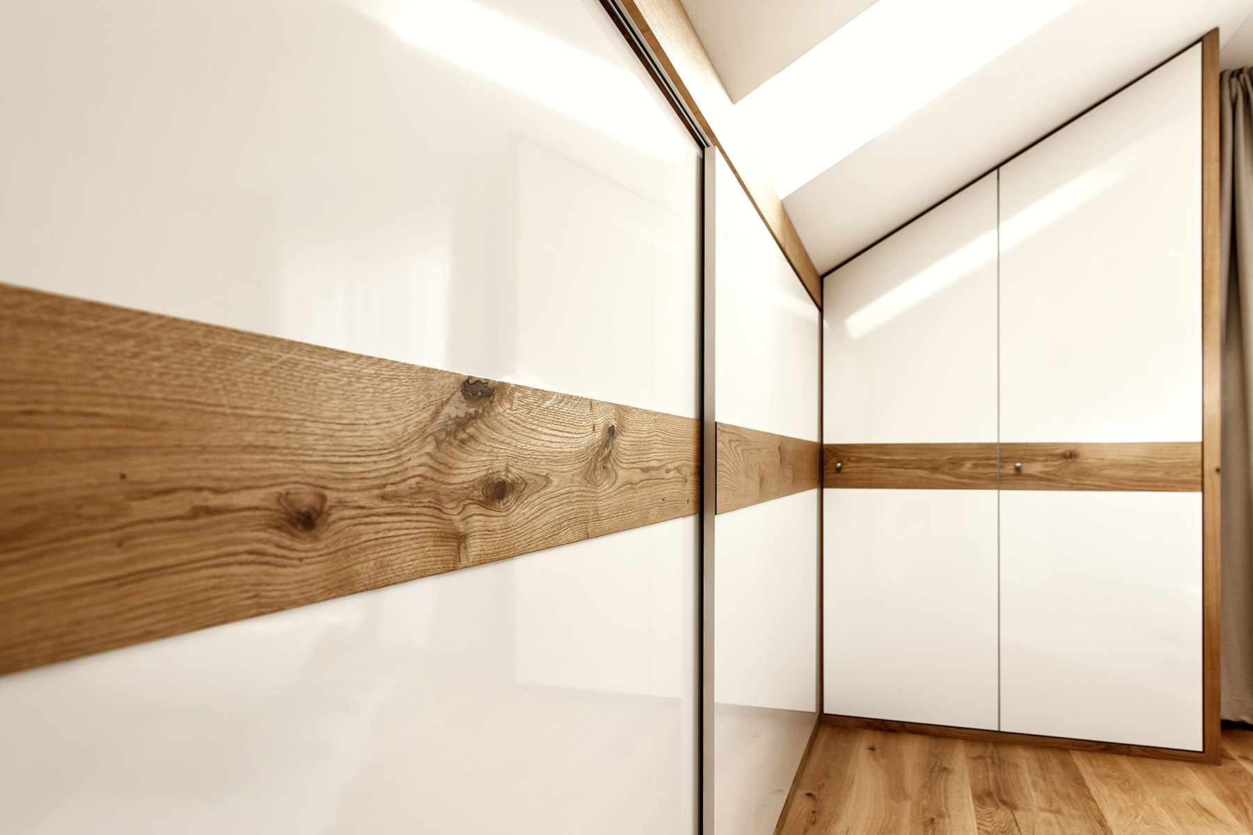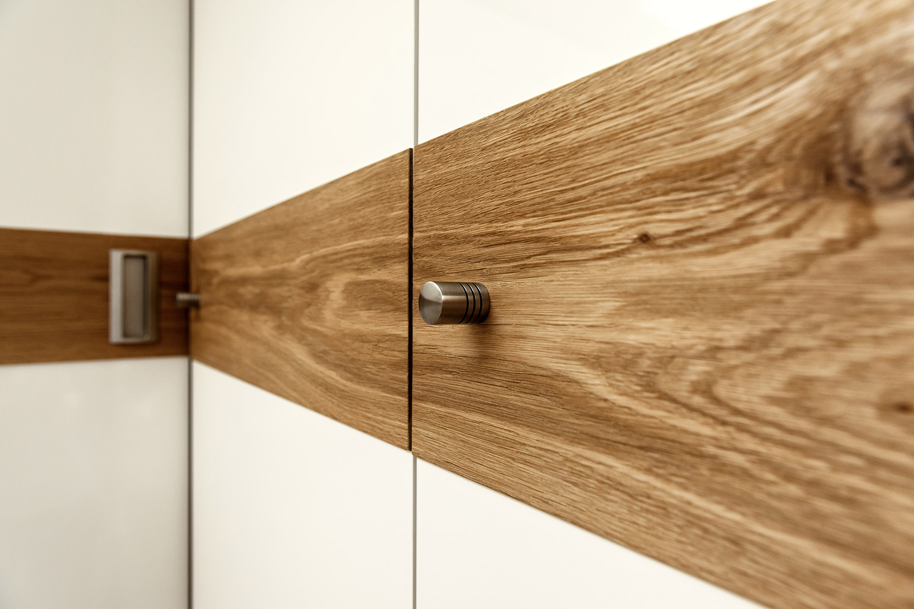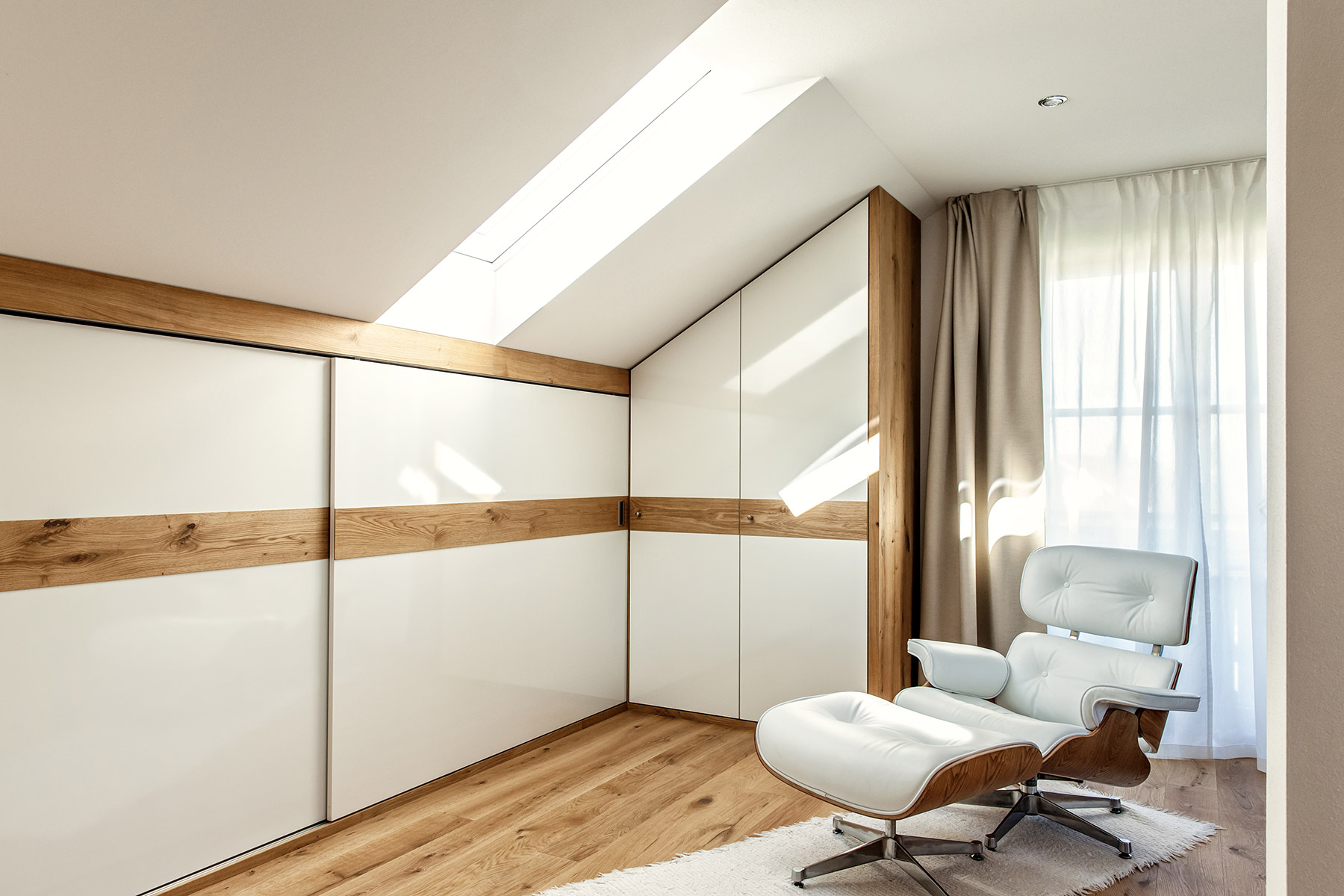 Von unserem Schreinermeister sind in detaillierter Handwerksarbeit hochwertige Einbaumöbel, abgestimmt auf die Wünsche der Kunden und Gegebenheiten des Raums, entstanden. Die Verwendung naturbelassener Materialen, wie dem geölten Eiche-Dielenboden und einer schlichten, hellen Gestaltung der Wände und Möbel, die beide Gestaltungselemente wiederspiegeln, schaffen einen zeitlosen und modernen Charakter der Raume.