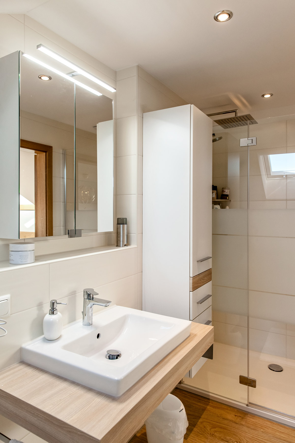 Diese Gestaltung setzt sich auch in dem komplett sanierten Badezimmer mit viel Tageslicht vom neuen Dachfenster fort. Hier entstand ein persönlicher Rückzugsort mit großer Regendusche direkt beim Schlaf- und Ankleidezimmer der Eltern.