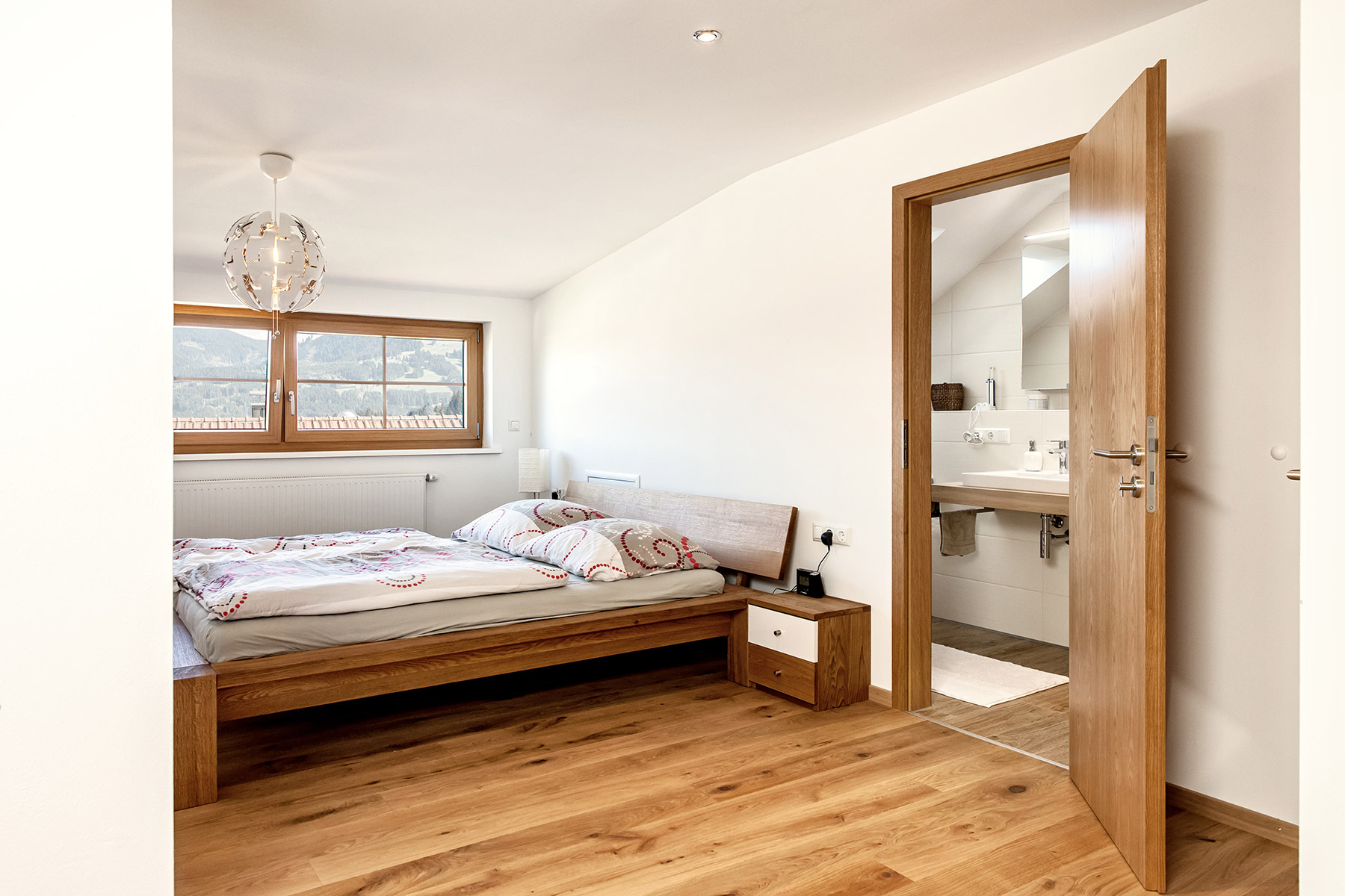 Das Elternschlaf- und Badezimmer unter dem Dach ist ein schönes Beispiel, wie gut sich moderne Ansprüche an die Raumgestaltung mit Zweckmäßigkeit und Ökologie verbinden lassen.