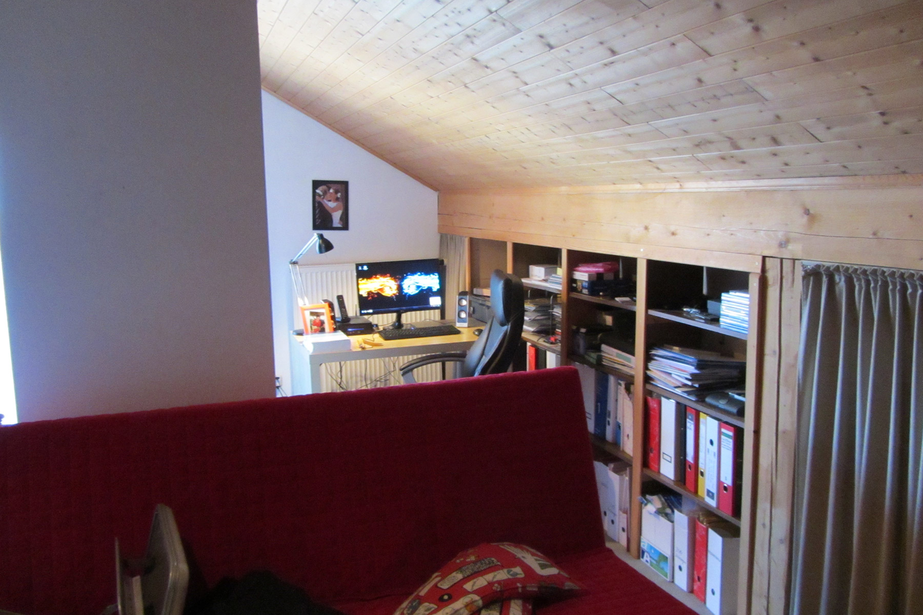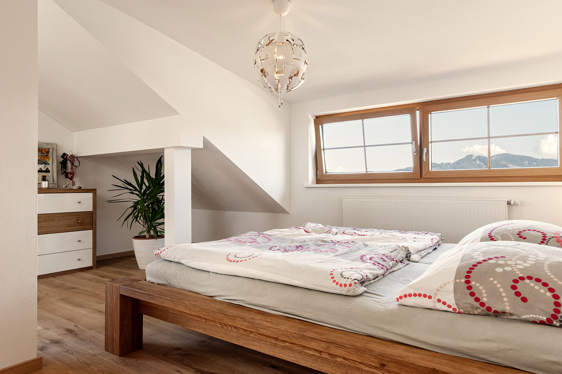 Durch die Entkernung des Dachgeschosses und die Entfernung der alten Dachverkleidung ist ein heller, freundlicher Raum entstanden. Die neue Gaube lässt viel Licht in den Raum und schafft neuen Wohn(t)raum unterm Dach. Außerdem gibt sie einen wunderbaren Blick auf die Allgäuer Alpenlandschaft frei.
