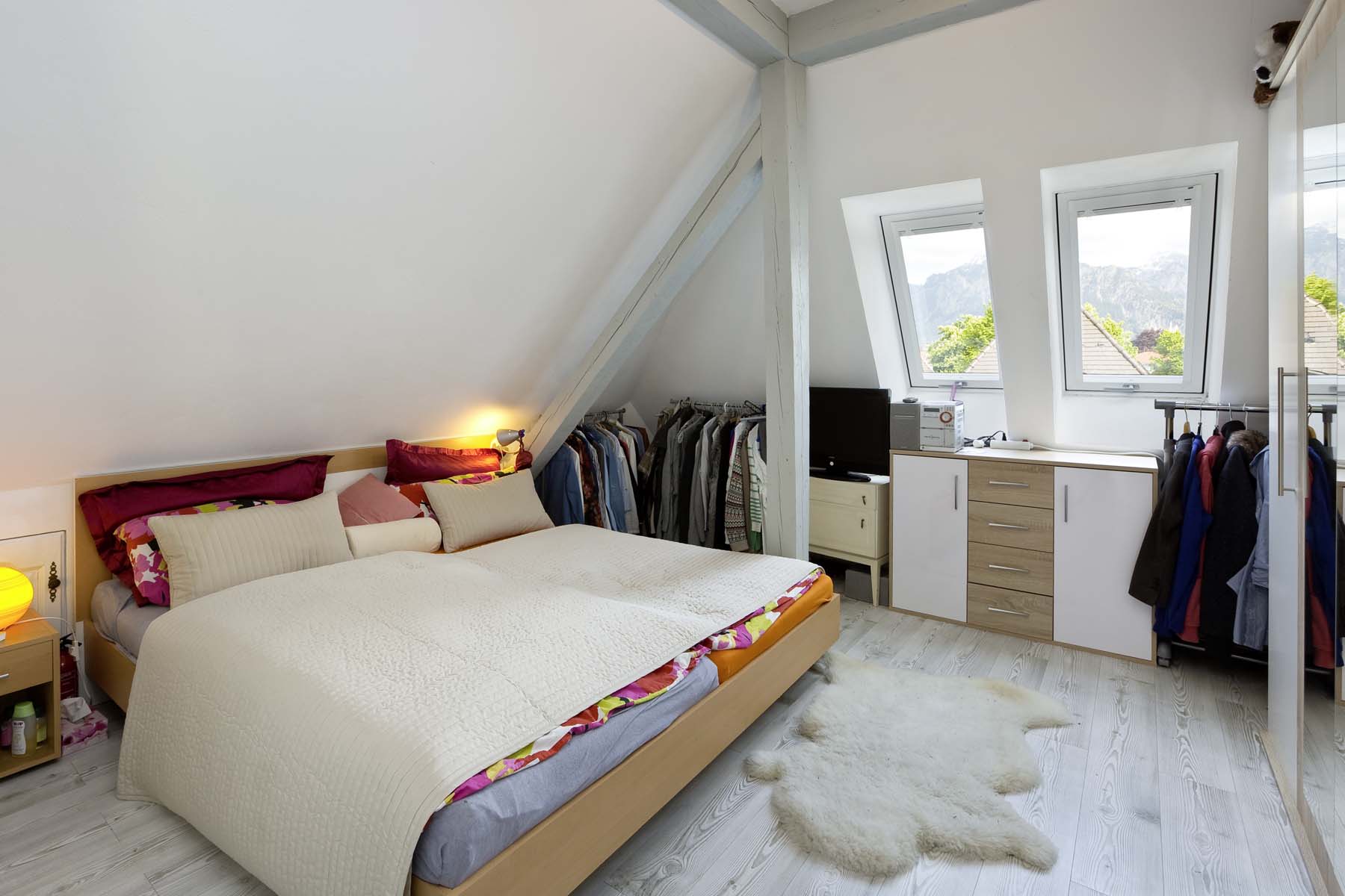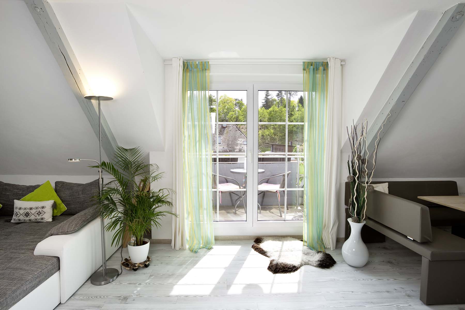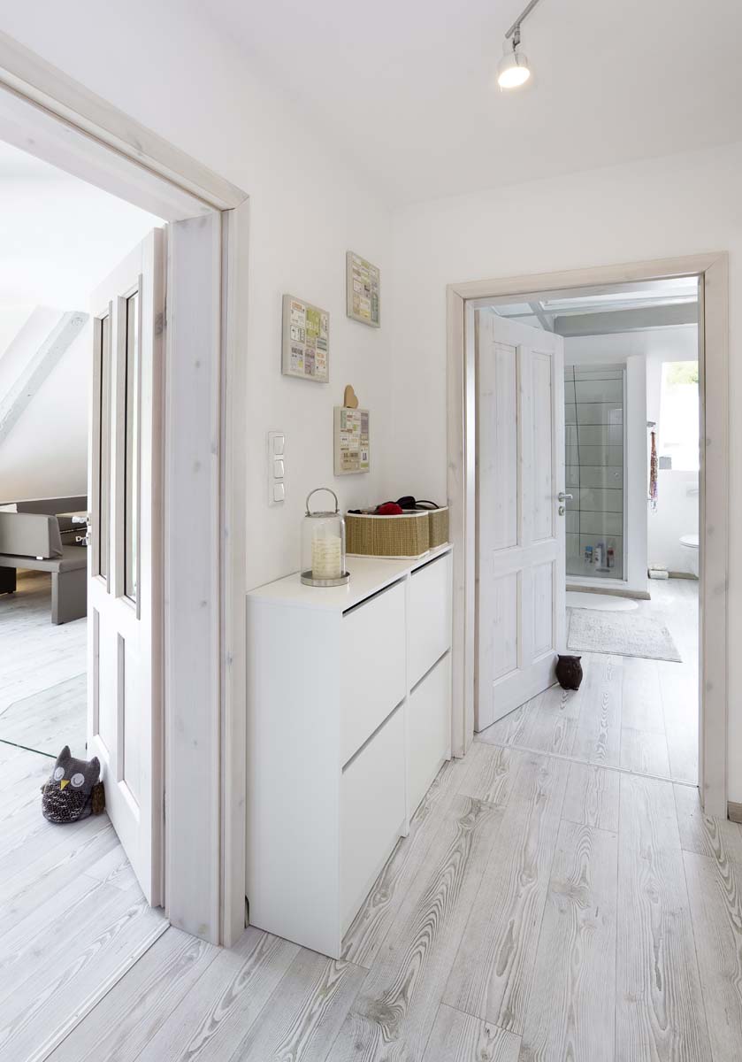 So wurde die Grundrissplanung überdacht, unnötige Zwischenwände und Abseitenwände entfernt um den Grundriss zu öffnen und mehr Raum zu schaffen. Südseitig wurde die kleine Gaube durch ein neue Gaube mit Dachbalkon ersetzt. So können die Bewohner des Dachgeschosses bei schönem Wetter draußen sitzen und die wunderbare Aussicht genießen. Zudem bringen die bodentiefen Fenster zusammen mit neuen zusätzlichen Dachfenstern mehr Licht in die Räume.