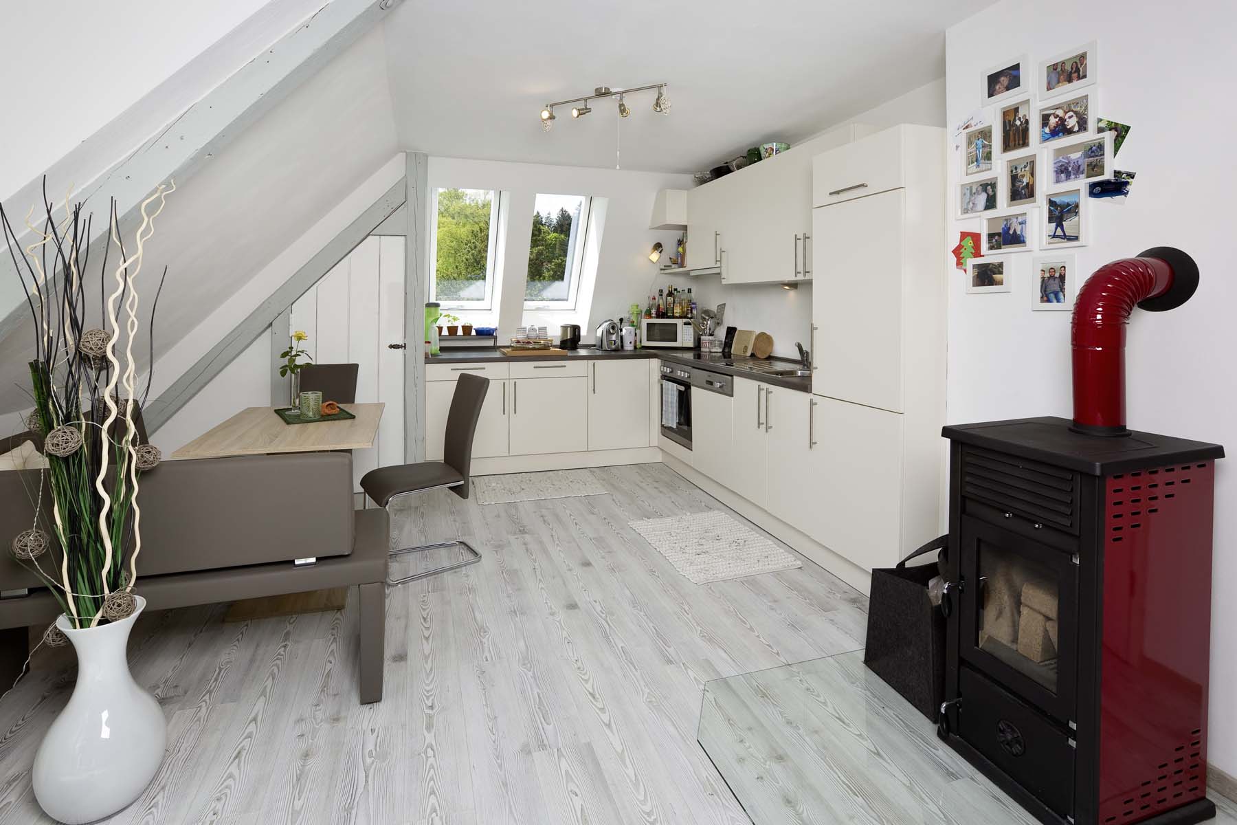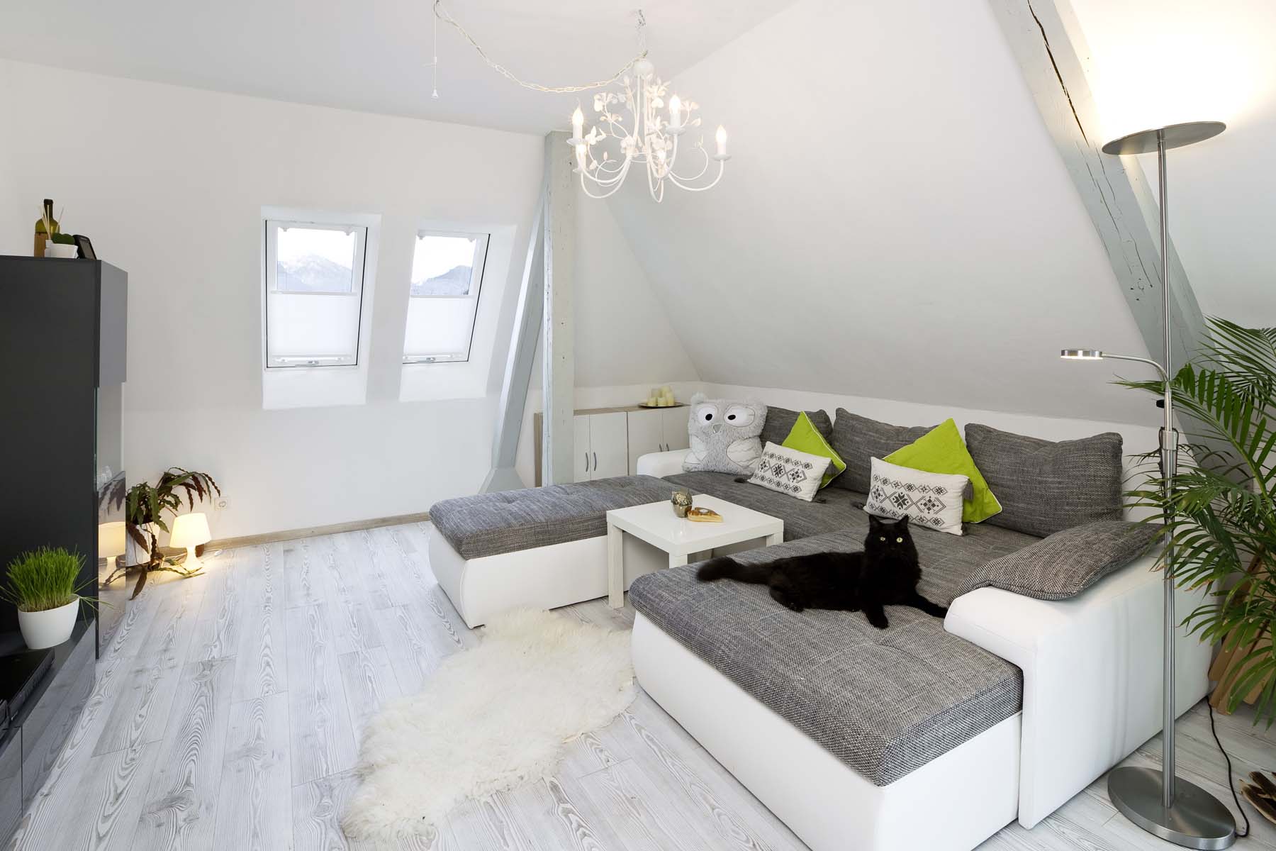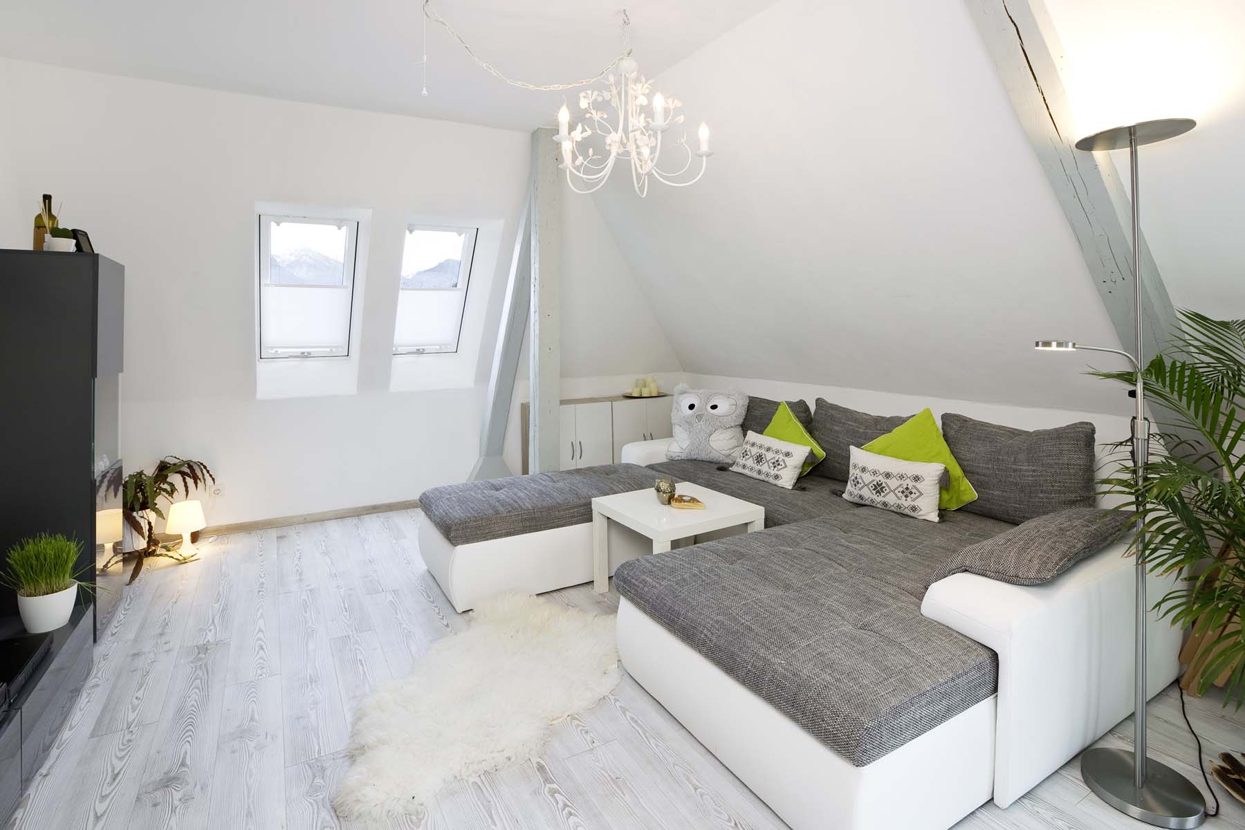 So wurde die Grundrissplanung überdacht, unnötige Zwischenwände und Abseitenwände entfernt um den Grundriss zu öffnen und mehr Raum zu schaffen. Südseitig wurde die kleine Gaube durch ein neue Gaube mit Dachbalkon ersetzt. So können die Bewohner des Dachgeschosses bei schönem Wetter draußen sitzen und die wunderbare Aussicht genießen. Zudem bringen die bodentiefen Fenster zusammen mit neuen zusätzlichen Dachfenstern mehr Licht in die Räume.