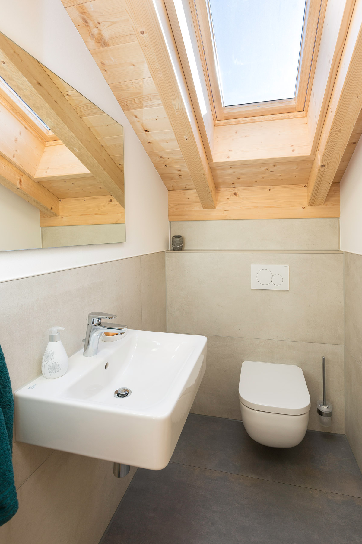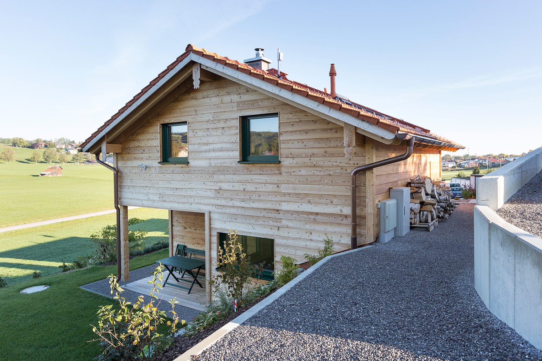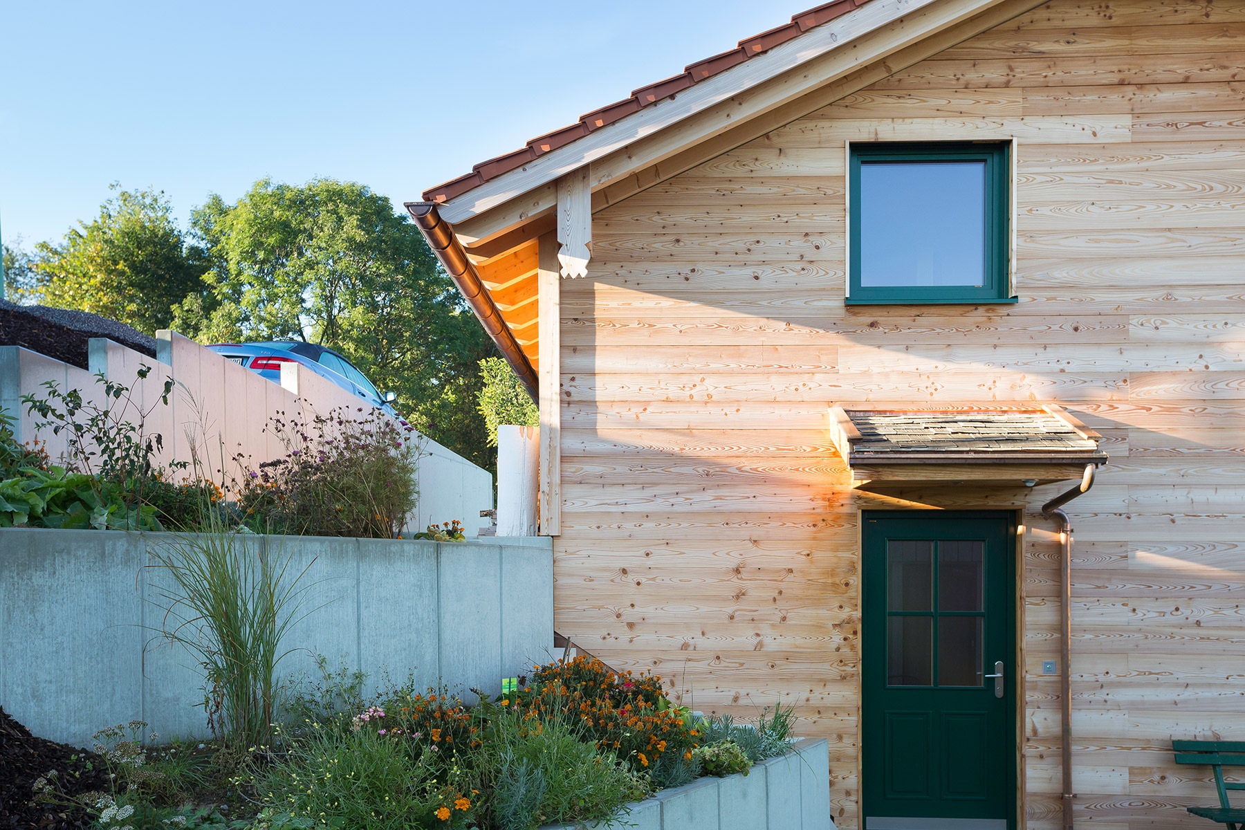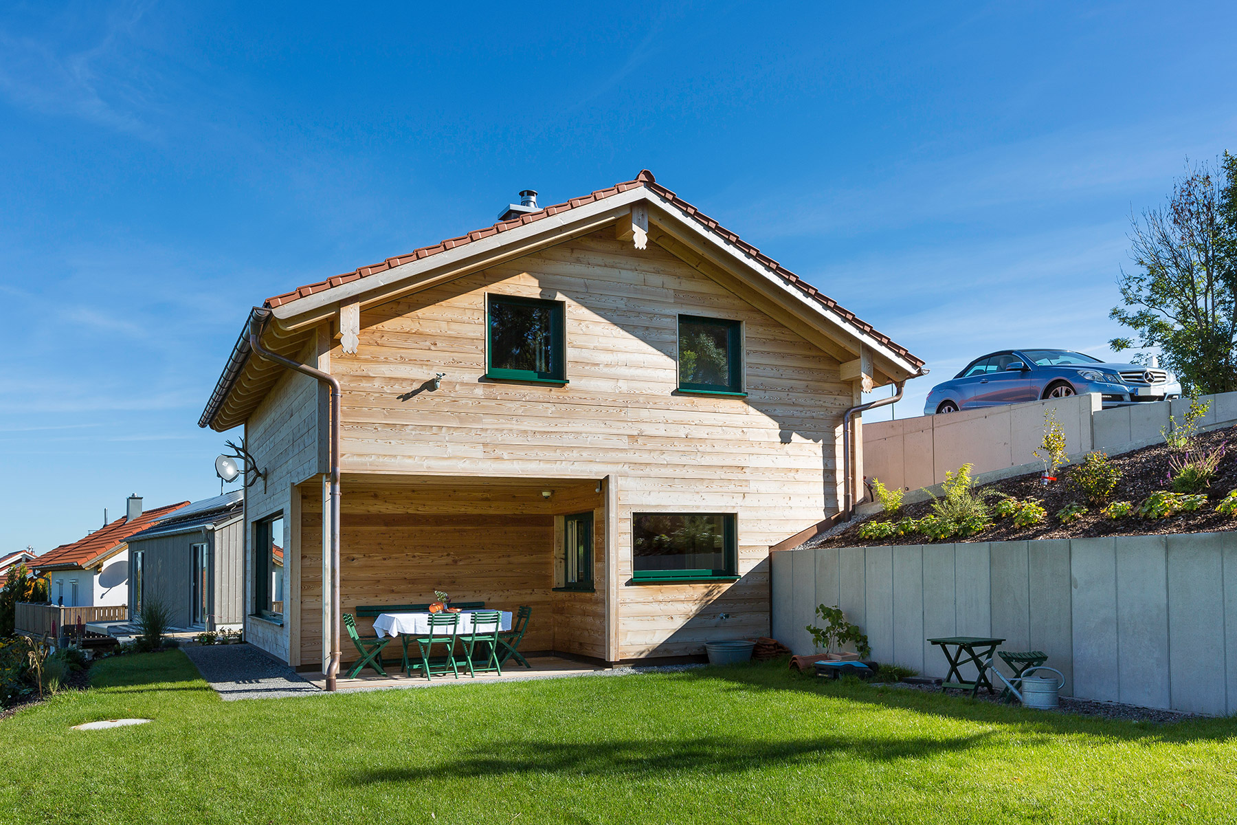 Durch die entsprechende Anordnung des Gebäudes auf dem Grundstück wurde Privatsphäre nicht nur in den Räumen, sondern bereits im Garten und auf der Terrasse geschaffen. Die gebürstete Lärchenholzverschalung, die traditionelle Pfettenbretter und die moosgrünen Gaulhofer Holz-Alu-Fenstermachen das Holzhaus schon von außen unverwechselbar.