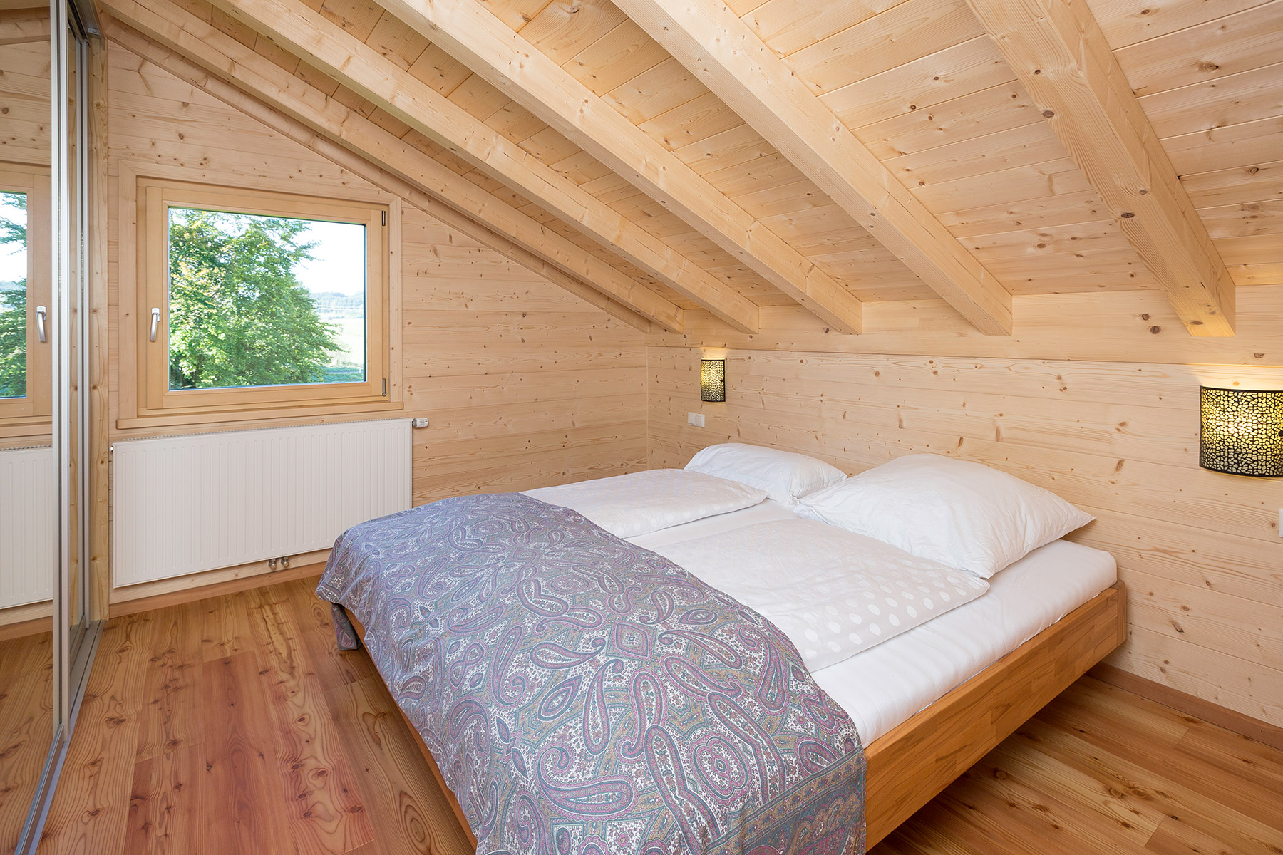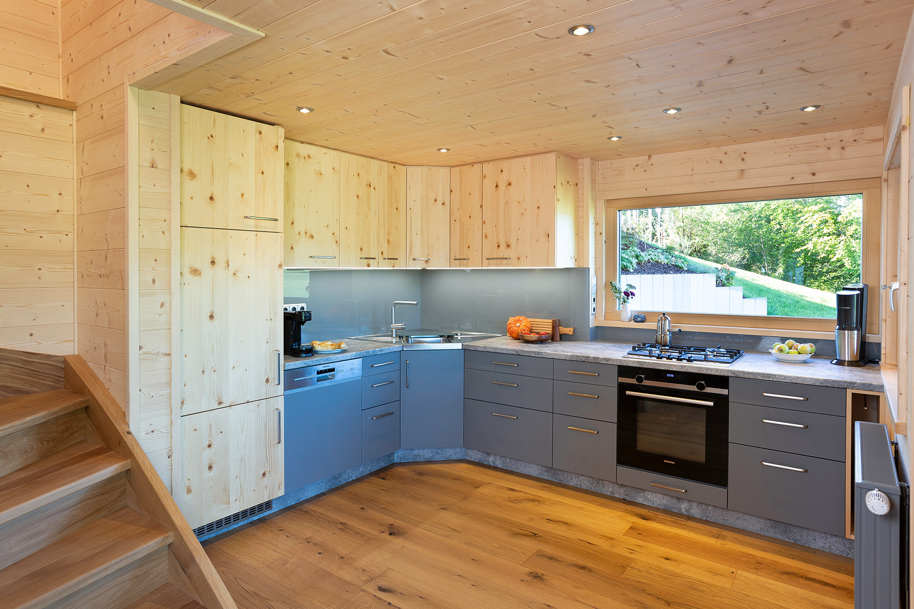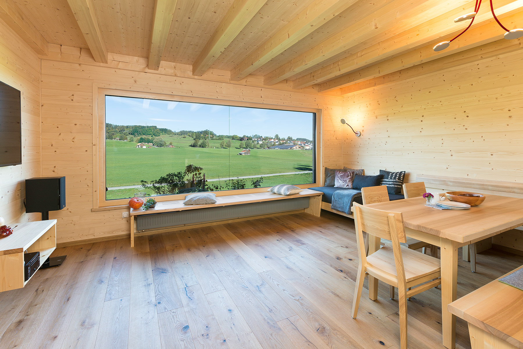 Modern präsentiert sich das Innere durch einen durchdachten Grundriss. Ein offen gestalteter Flur erschließt den geräumigen Koch-, Ess- und Wohnbereich. Durch den naturgeölten Holzboden und die Holzverschalung der Wände entsteht eine angenehme Kombination aus Behaglichkeit und Eleganz der Räume. In aller Ruhe kann man durch die weitläufige Fensterfront im Wohnzimmer den Blick ins Grüne genießen. Der im Wohnraum integrierte Holzofen sorgt an kalten Tagen zusätzlich für behagliche Wärme. Zusammen mit der, typisch für ein Hauser Holzhaus, exzellenten Gebäudehülle, gedämmt mit natürlicher Holzfaser, entstand ein neues Ferien-Domizil zum Wohlfühlen,