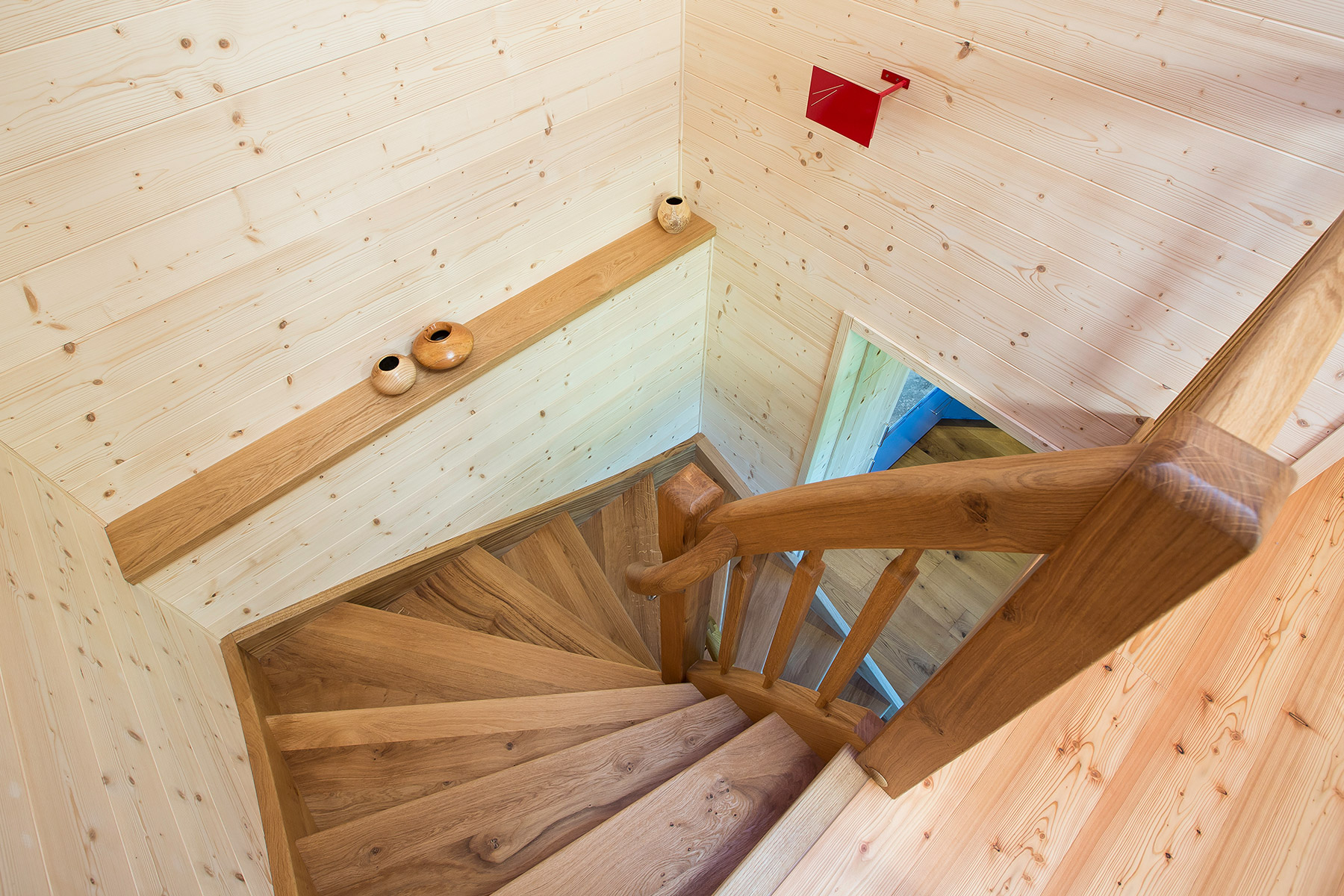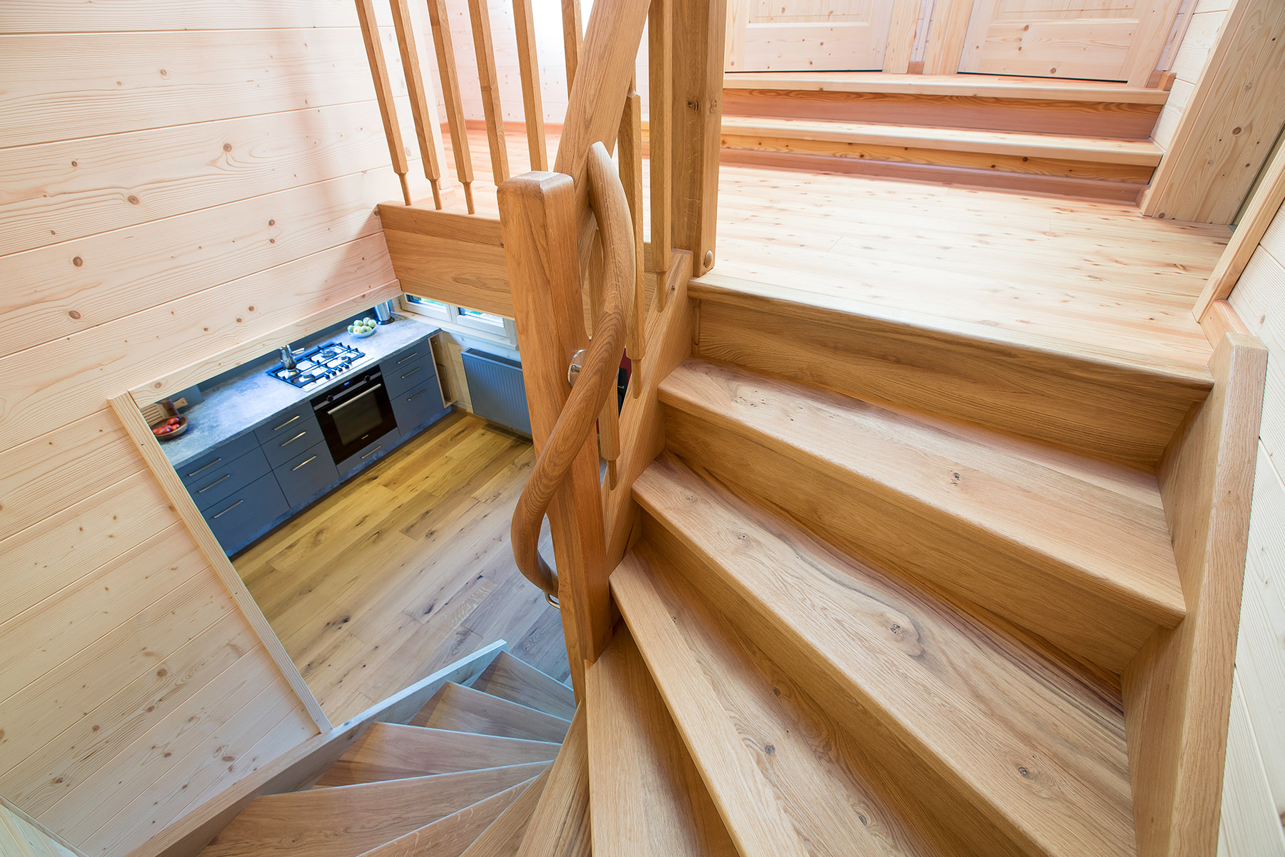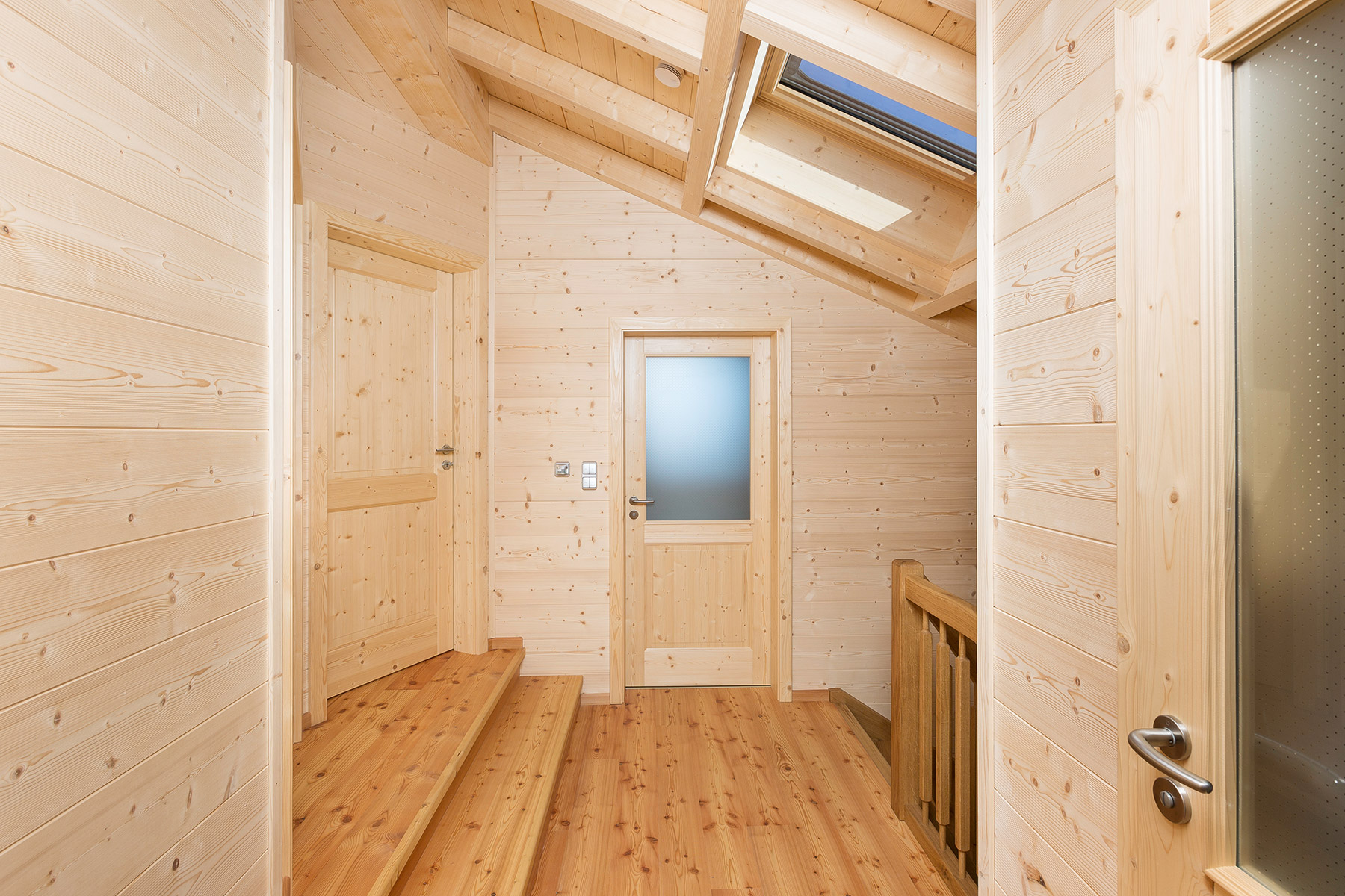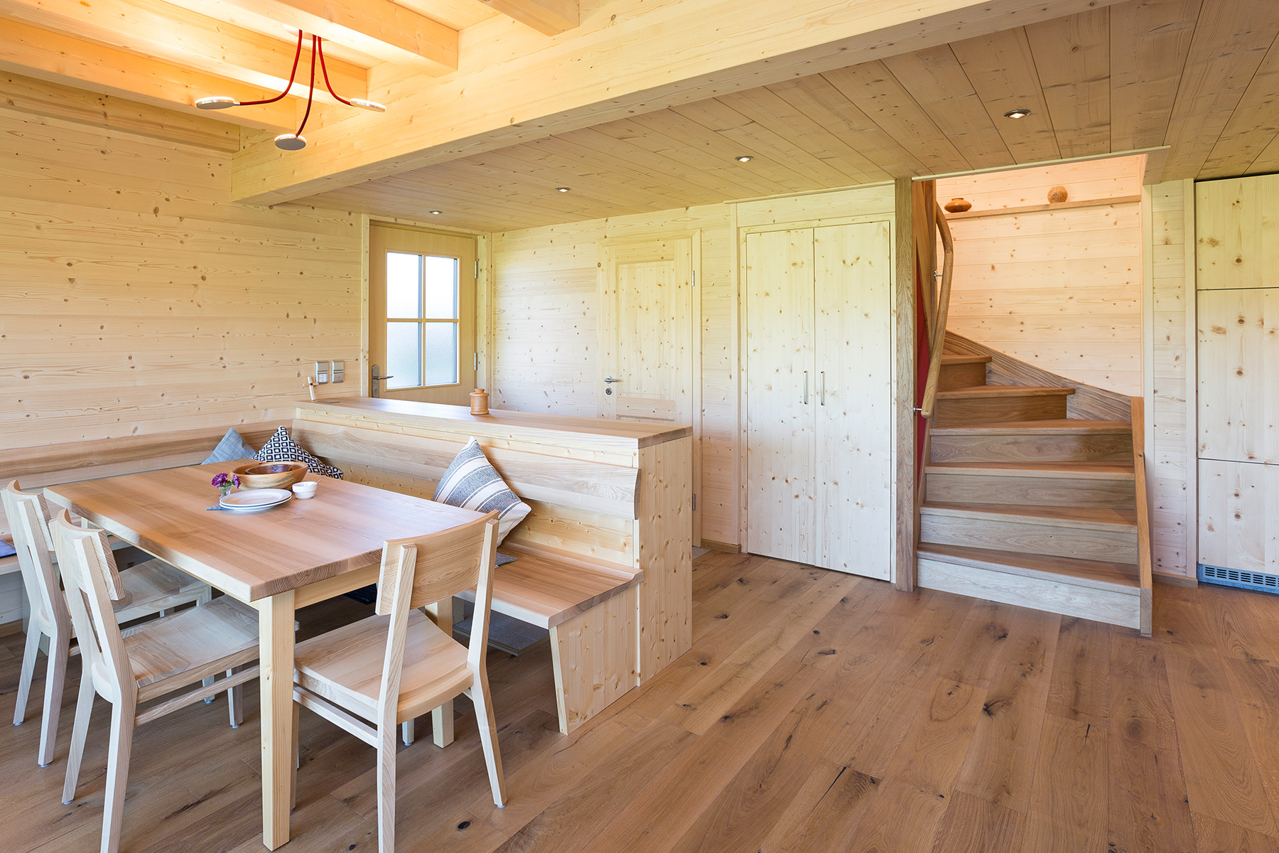Modern präsentiert sich das Innere durch einen durchdachten Grundriss. Ein offen gestalteter Flur erschließt den geräumigen Koch-, Ess- und Wohnbereich. Durch den naturgeölten Holzboden und die Holzverschalung der Wände entsteht eine angenehme Kombination aus Behaglichkeit und Eleganz der Räume. In aller Ruhe kann man durch die weitläufige Fensterfront im Wohnzimmer den Blick ins Grüne genießen. Der im Wohnraum integrierte Holzofen sorgt an kalten Tagen zusätzlich für behagliche Wärme. Zusammen mit der, typisch für ein Hauser Holzhaus, exzellenten Gebäudehülle, gedämmt mit natürlicher Holzfaser, entstand ein neues Ferien-Domizil zum Wohlfühlen,