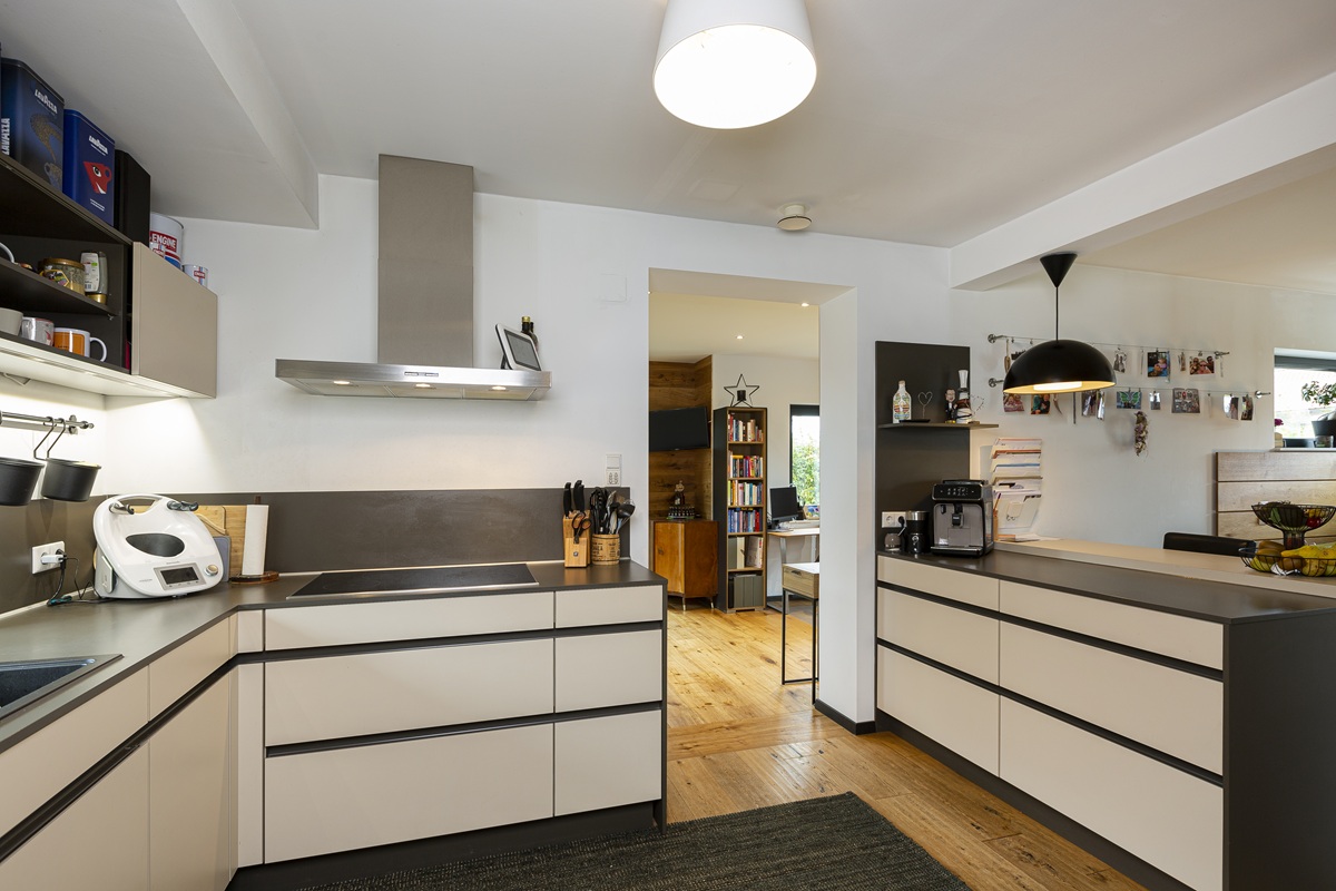 Ein Anbau in Holzständerbauweise mit durchgehender Dämmung, offener Balkendecke und Putzfassade in Weiß. Fenster mit elektrischen Raffstores und harmonischer Integration ins Bestandsdach.