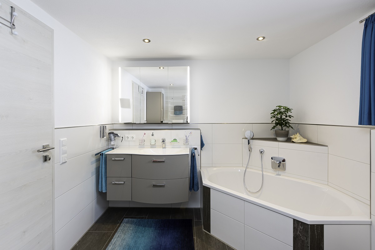 Auch das Badezimmer erfuhr eine Verwandlung: Durch den Wegfall einer Wand entstand mehr Raum, der durch ein modernes Fliesenlayout optisch zusätzlich vergrößert wird. Eine großzügige Eckbadewanne sowie eine bodengleiche Dusche bieten höchsten Komfort.