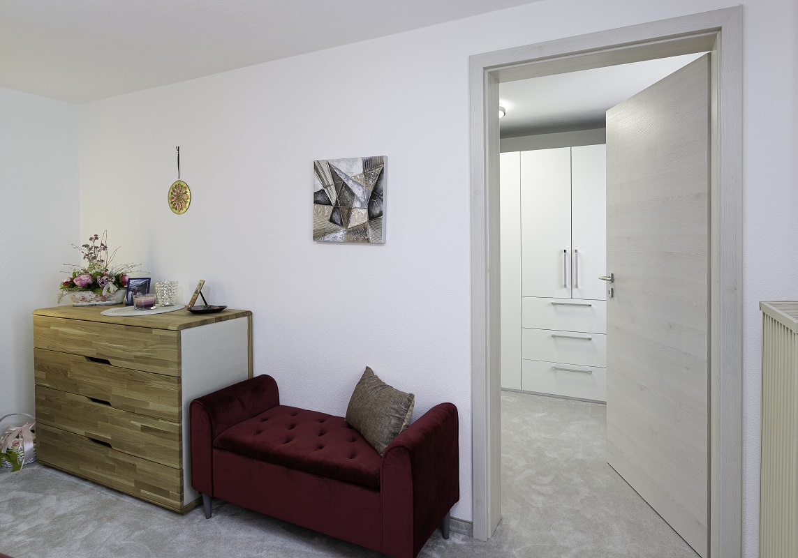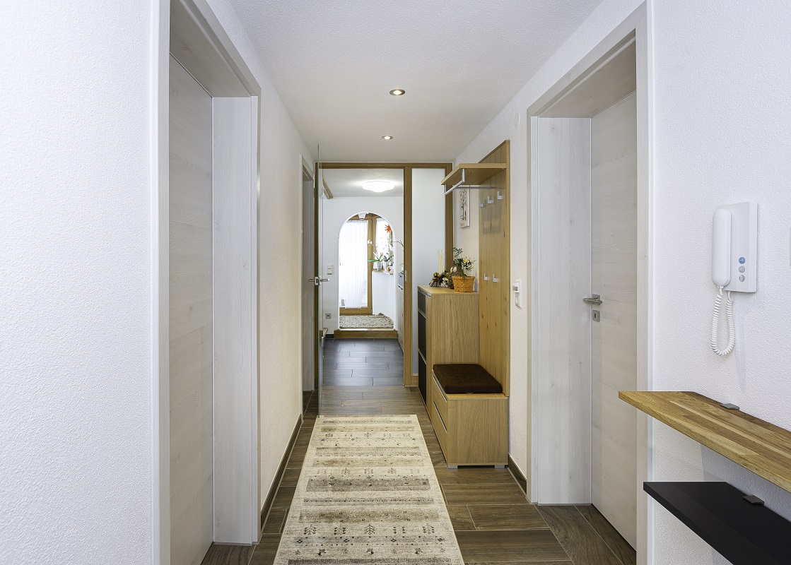 Das Obergeschoss dieses Mehrfamilienhauses wurde umfassend saniert, um zeitgemäßen Wohnkomfort zu schaffen. Besonders der Eingangsbereich hat sich durch den Umbau stark verändert: Die alte, dunkle Treppe wich einer neuen, lichtdurchlässigen Konstruktion, die den gesamten Bereich offener und einladender wirken lässt. Ein neuer Fliesenboden in Holzoptik harmoniert mit weißen Holztüren und sorgt für ein freundliches Ambiente.