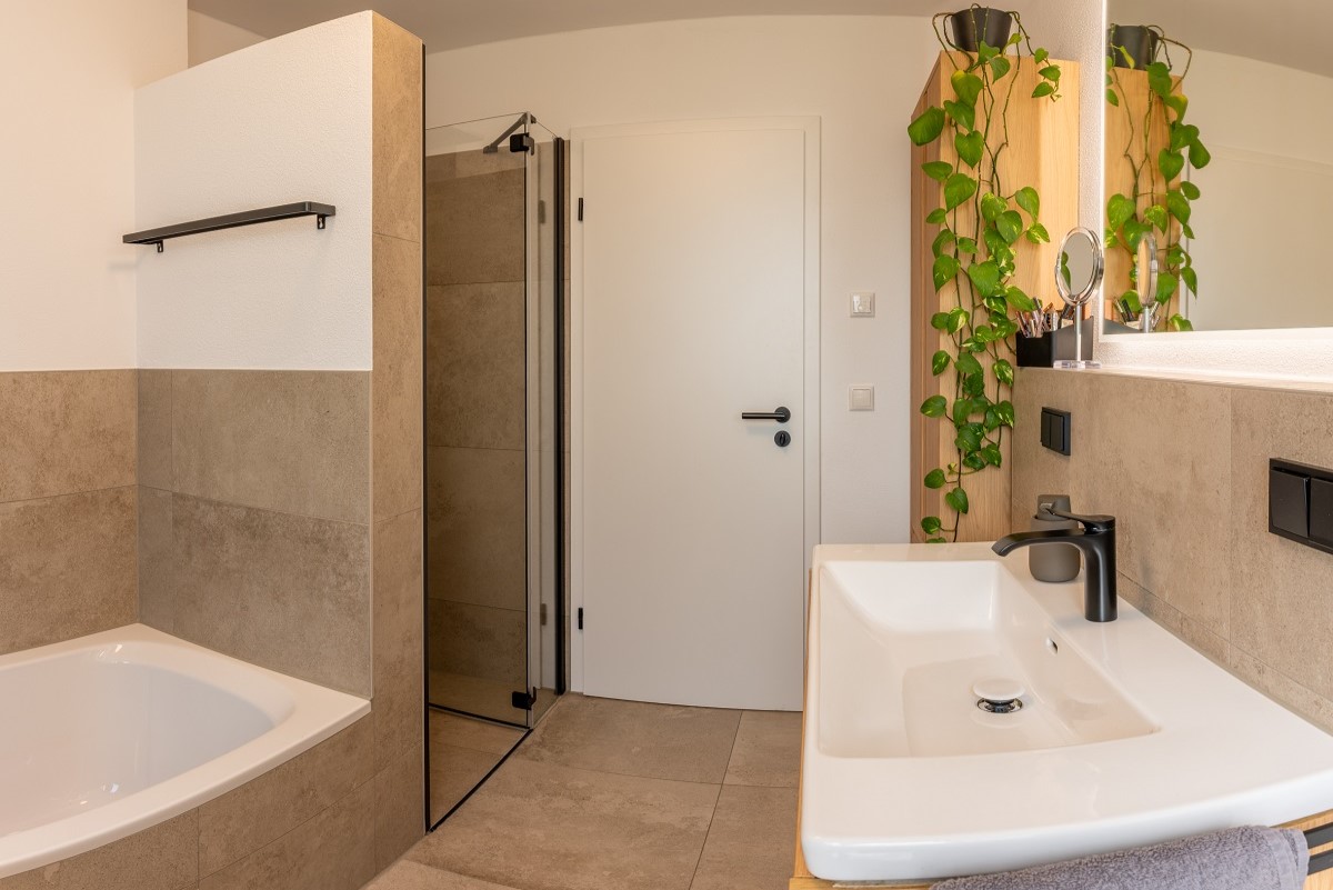 - Großformatige Fliesen 60×60 cm für ein ruhiges, elegantes Gesamtbild