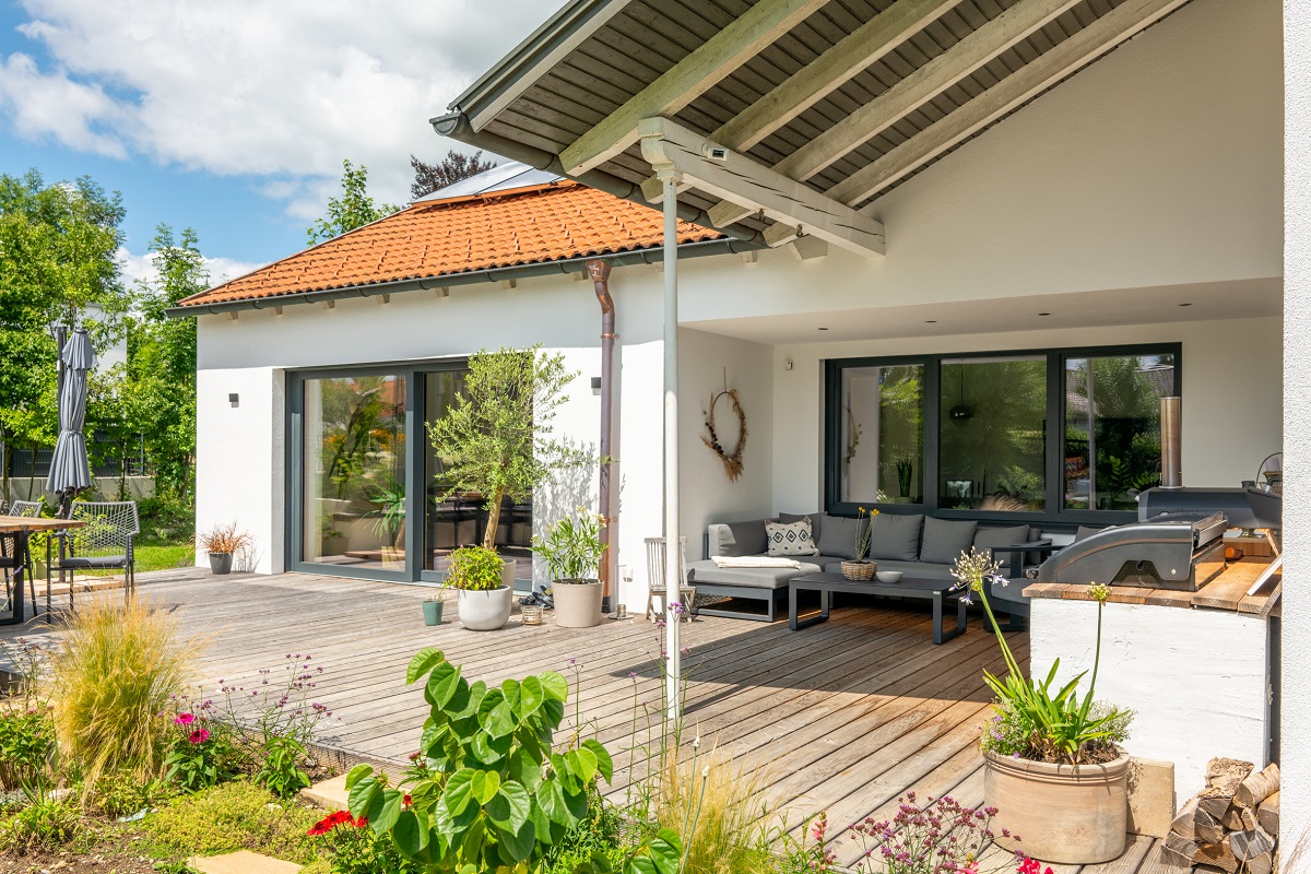 - Außenbereich: Holzterrasse mit Riffeldiele auf Unterkonstruktion