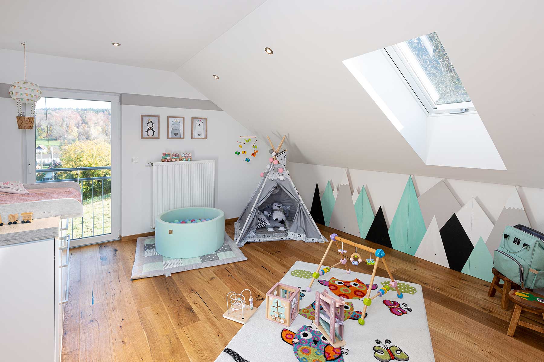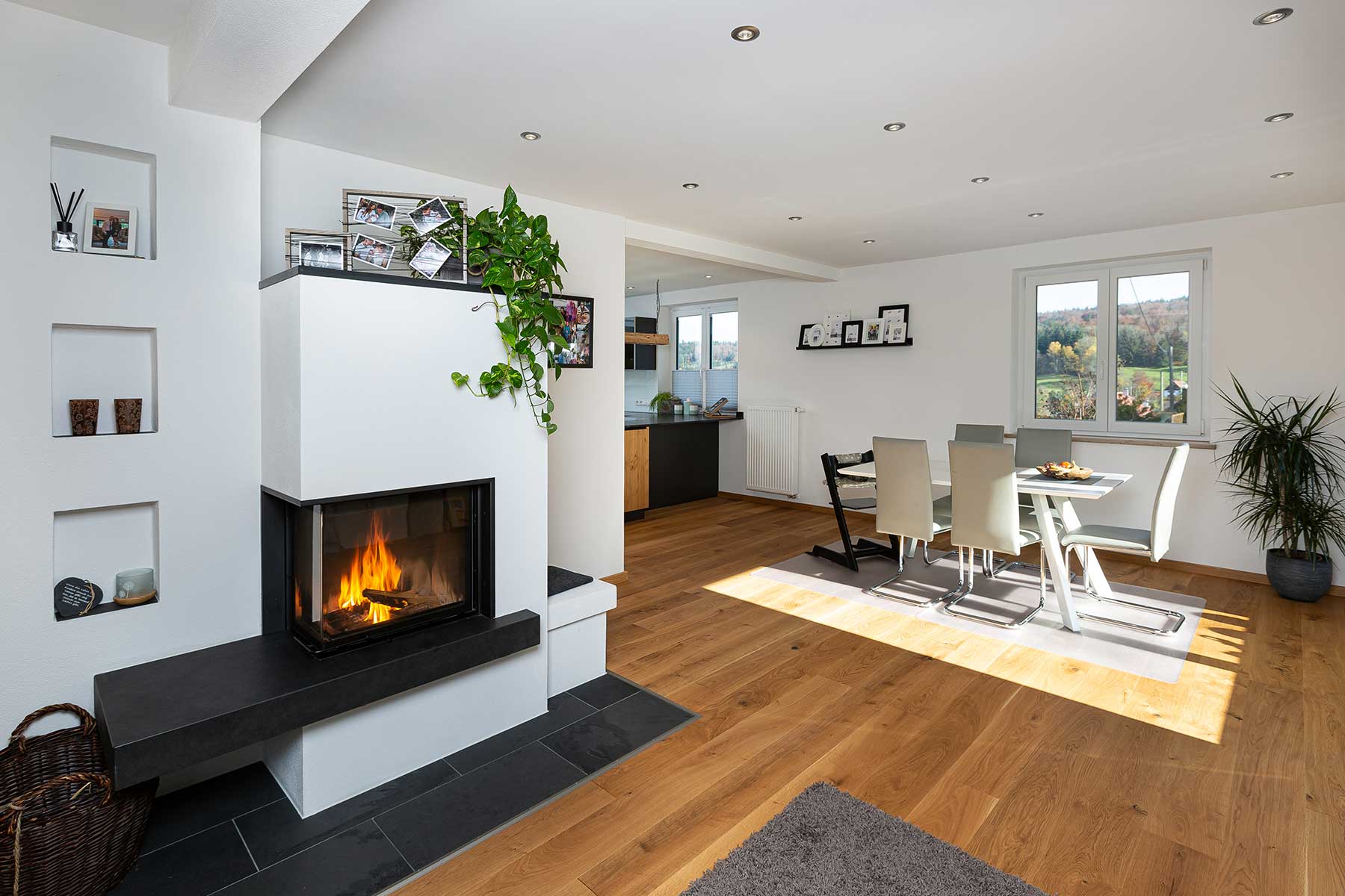 Das Einfamilienhaus der jungen Familie erstrahlt nach den Umbaumaßnahmen im Rahmen einer Komplettmodernisierung in neuem Glanz. Diese Sanierungsform bietet die Chance, den Grundriss und das Design an aktuelle Familienbedürfnisse anzupassen. Durch die Errichtung einer Schleppdachgaube wurde beispielsweise mehr Platz geschaffen und durch das Entfernen einer Trennwand konnte ein heller, freundlicher Wohn- und Essbereich gestaltet werden. Daneben steigern die Sanierungsmaßnahmen durch moderne Dämmsysteme die Energieeffizienz.