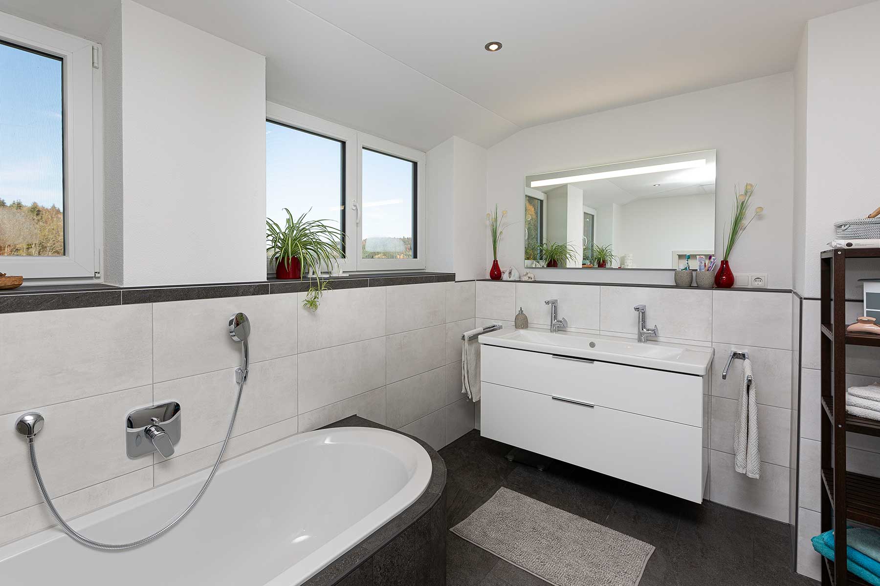 Das Badezimmer wurde ebenfalls neu gestaltet. Hier sorgt das Farbspiel von hell und dunkel für einen modernen Flair.