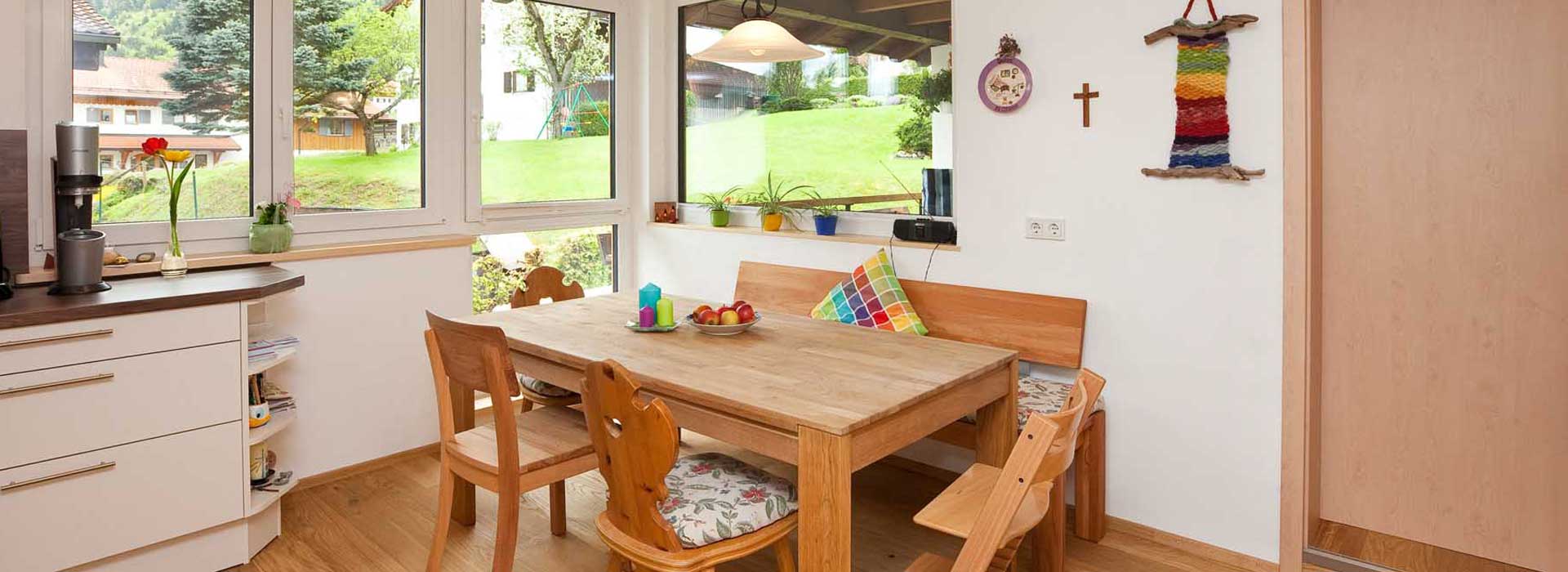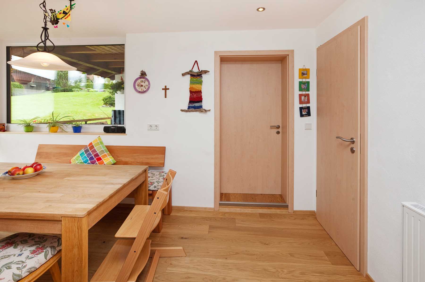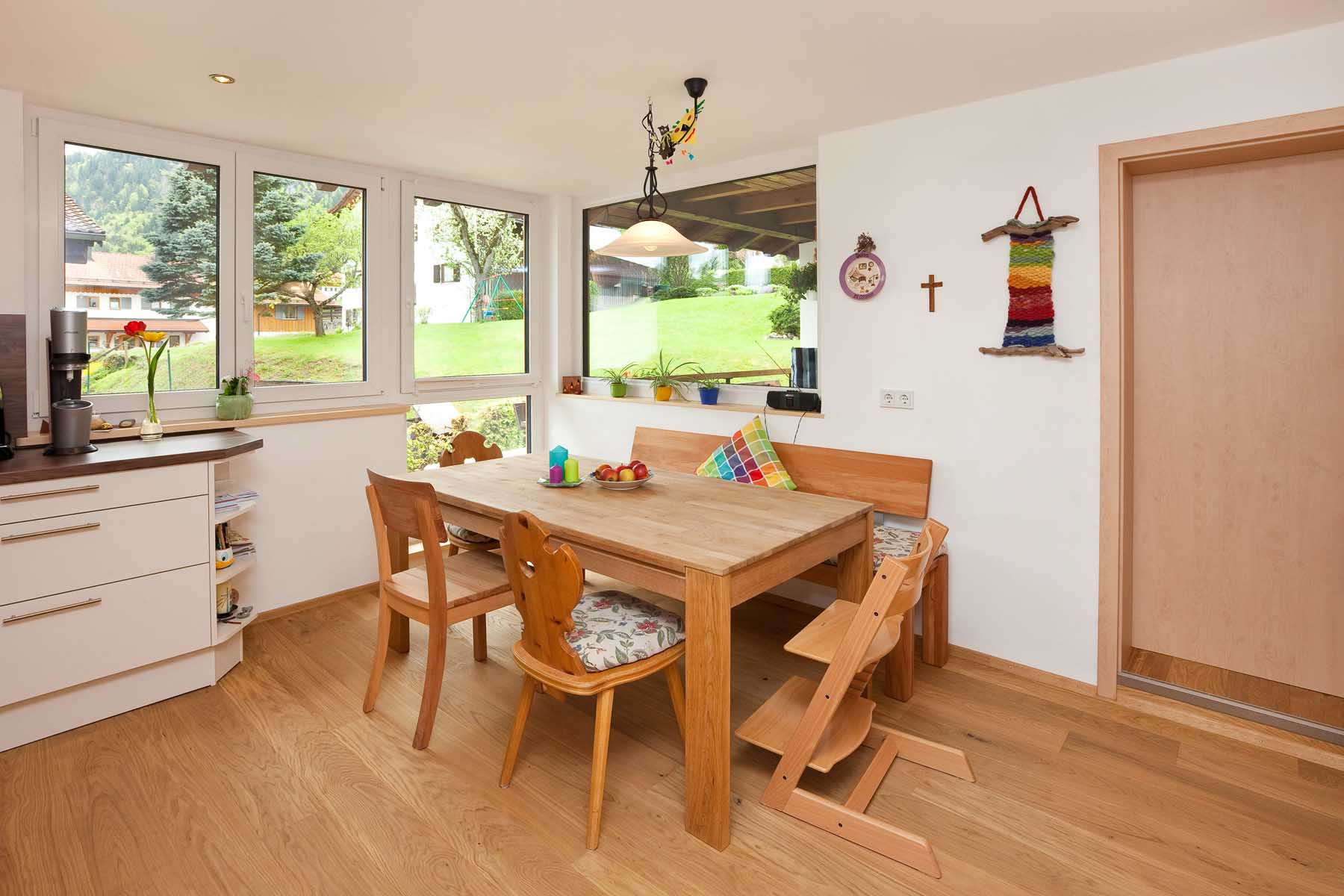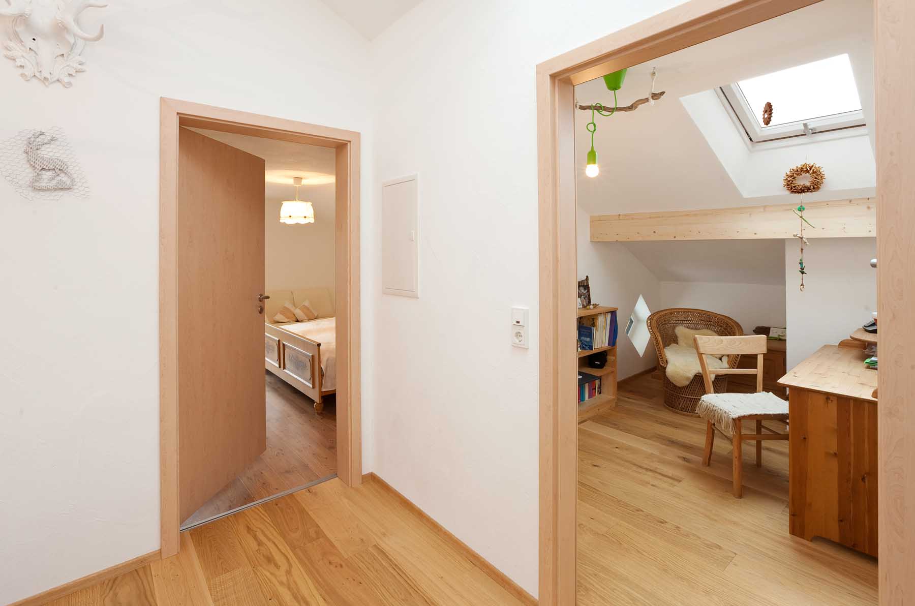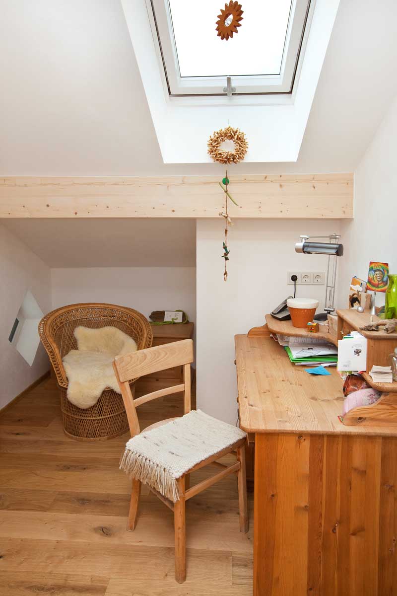 Im Dachgeschoss wurde der Grundriss komplett neu gestaltet. Die Küche wurde zum Badezimmer umfunktioniert und das Bad zur Waschküche. Küche und Esszimmer finden nun auf der hellen Südseite durch die Erweiterung des Wohnraumes auf den Balkon ausreichend Platz. Im Treppenhaus wurde ungenutzter Raum zu einem gemütlichen Arbeitszimmer gemacht und der Flurbereich durch entfernen der Zangenlage nach oben hin geöffnet. Durch diese Maßnahme und ein zusätzliches Dachfenster erscheint der Flur nun hell und geräumig.