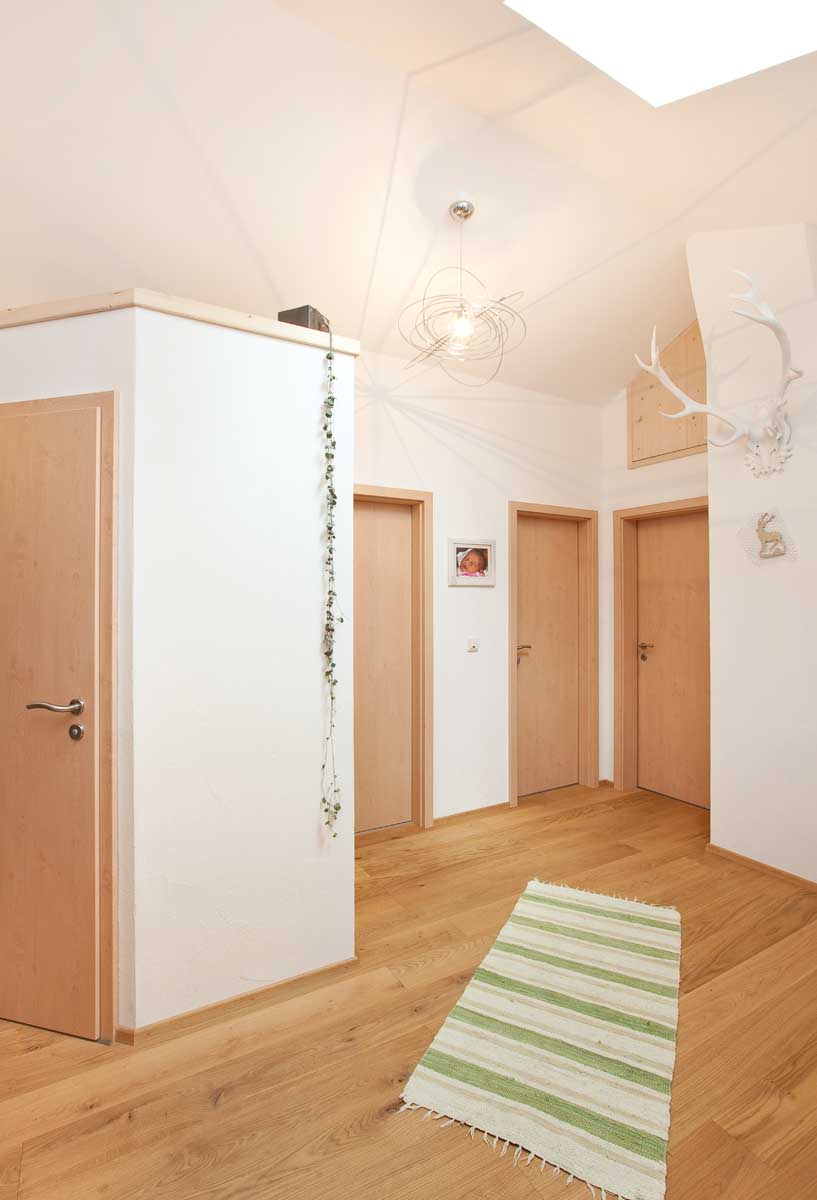 In einem der ehemaligen Schlafzimmer wurde eine Gaube aufgebracht, die Platz und Licht für das neue Kinderzimmer bringt. Im Wohnzimmer öffnet eine neue Schiebetüre den Raum Richtung Balkon und schafft so eine Verbindung zwischen innen und Außen – und zusätzlich viel Licht. So entstand im vorher etwas düsteren Dachgeschoss eine helle, freundliche Wohnung – und in der Eingangshalle kann man jetzt sogar gut Flieger fliegen lassen…