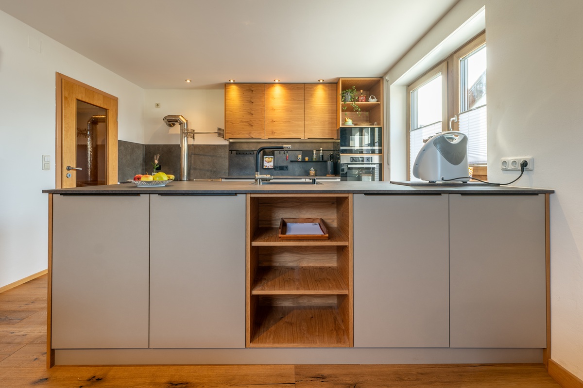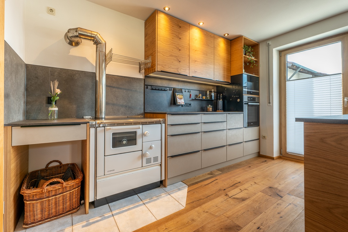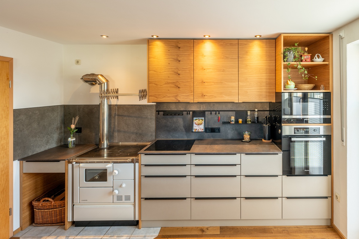 Ausgangslage für die neue Küche war es, den bestehenden Holzherd zu integrieren. Daher wurde die Küche von Hauser nicht einfach nur modernisiert sondern neu gedacht, angepasst und stimmig umgesetzt. So wurde sie ein Mittelpunkt des Wohnens – funktional und mit Flair zugleich.