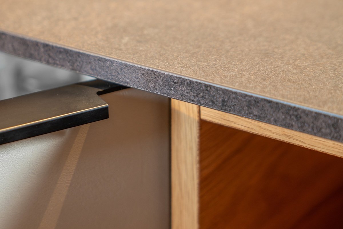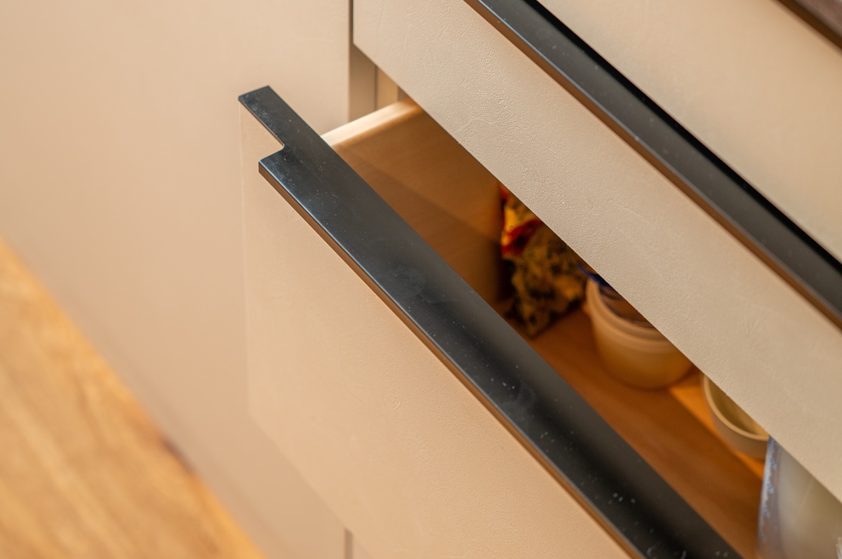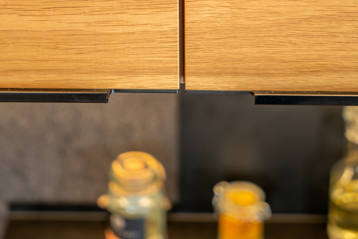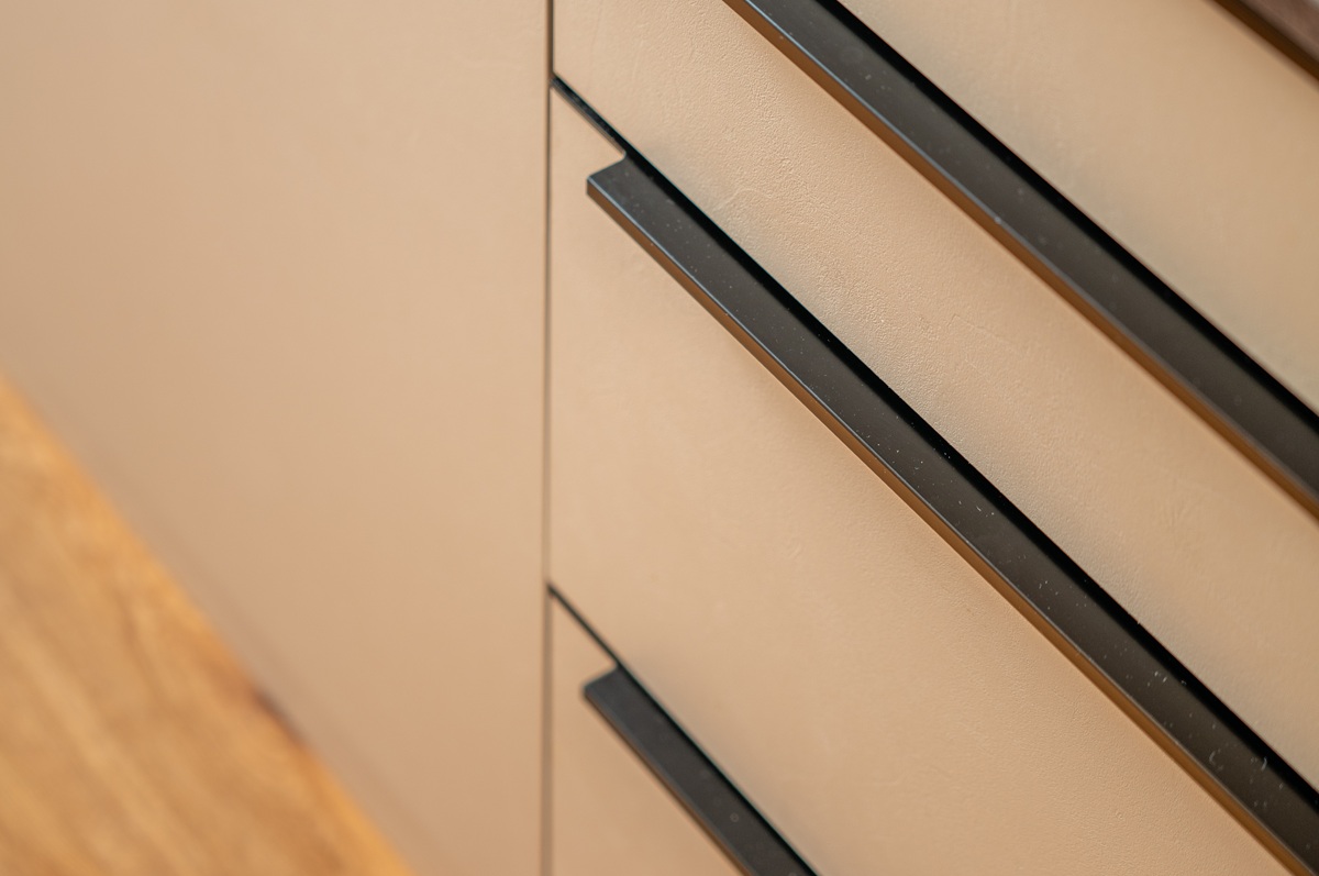 Bei der Umsetzung wurde der Grundriss neu strukturiert und ein stimmiges Beleuchtungskonzept integriert. Dabei fügen sich die maßgefertigten Möbel, der bestehende Herd und die moderne Technik nahtlos zusammen – so entstand eine durchdacht gestaltete, harmonische Wohnküche mit einem klaren Gesamtcharakter.