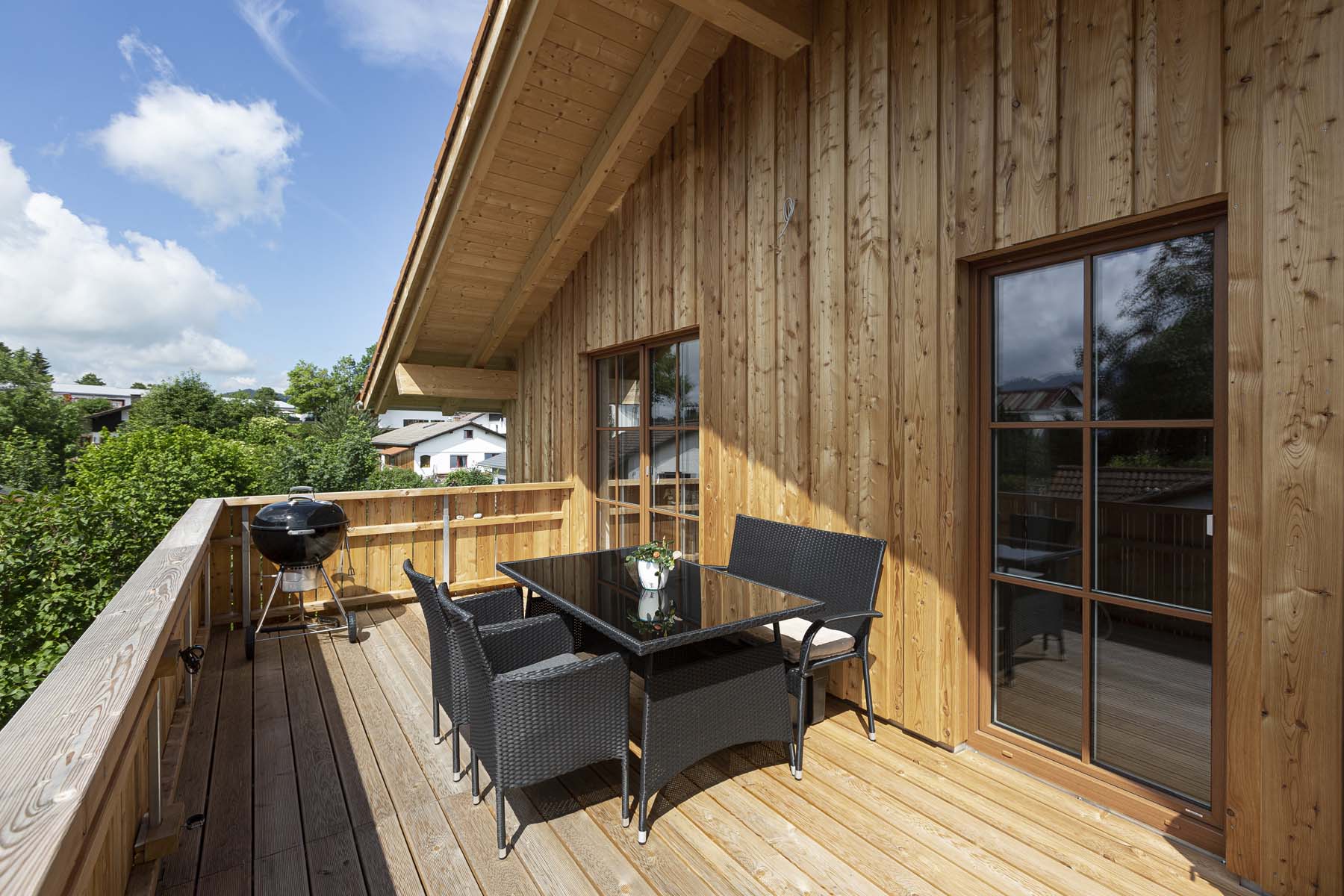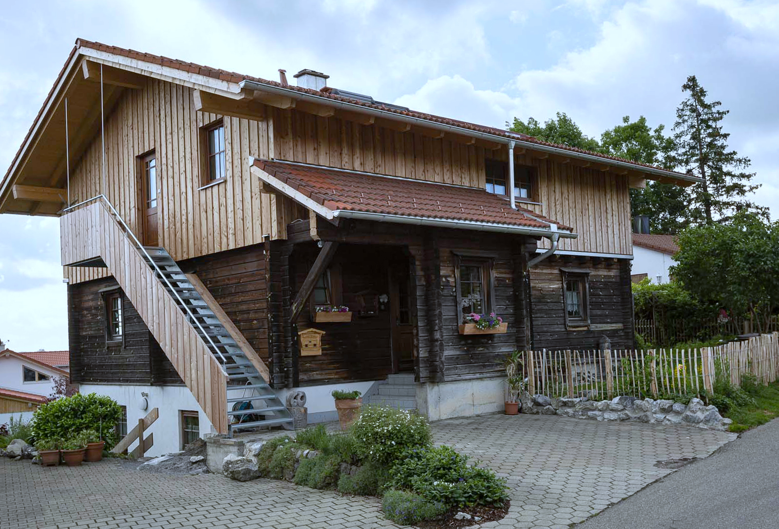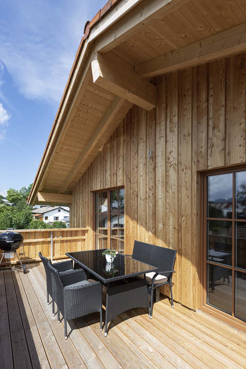 An der Südseite des Hauses wurde ein Balkon aus Fichtenholz über die bestehende Terrasse gesetzt. Eine großzügige und gemütliche Dachterrasse mit genügend Platz für die ganze Familie ist entstanden. Auch hier zeigen die Vorher- Nachher-Bilder wie neuer, modernen Wohnraum entstanden ist.