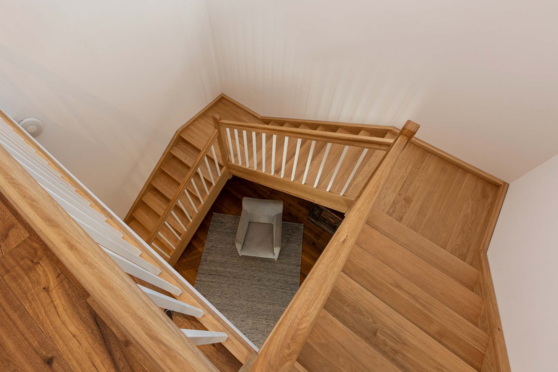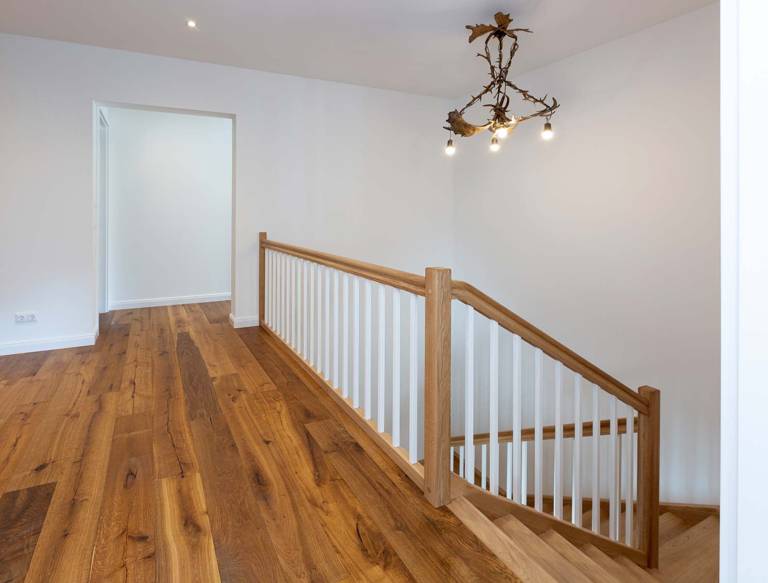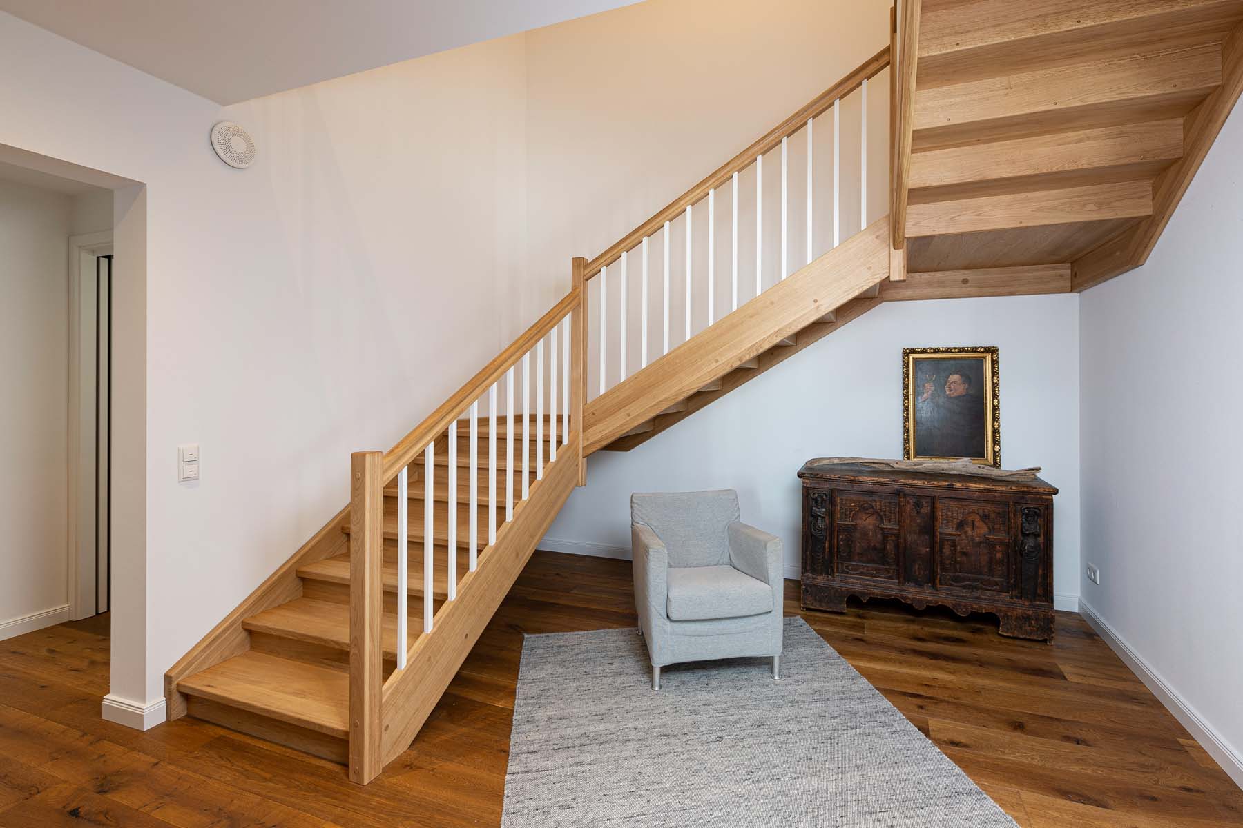 Der Eingangsbereich mit großzügiger Podesttreppe in Eiche sieht bereits den Raum für einen späteren Aufzug vor.