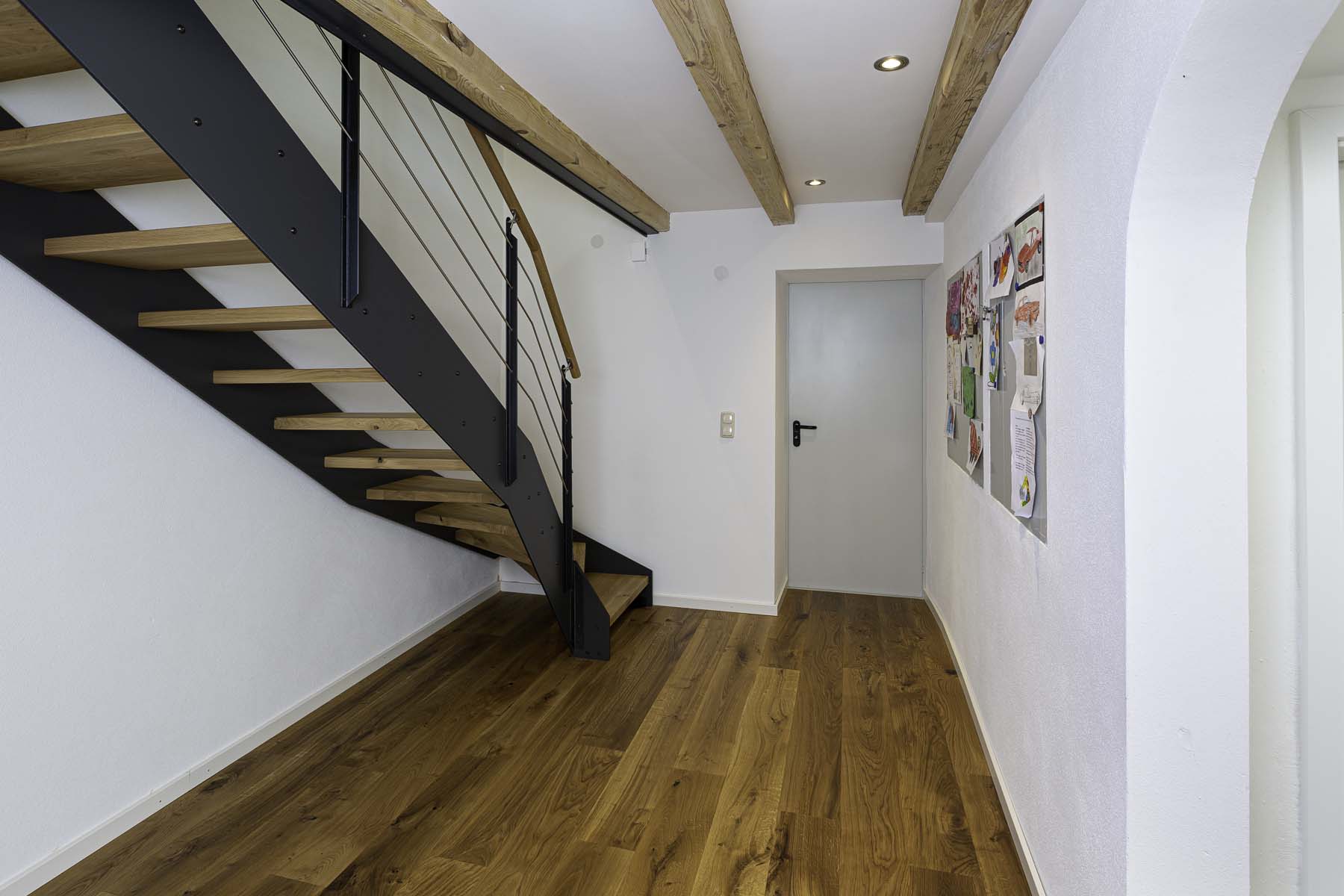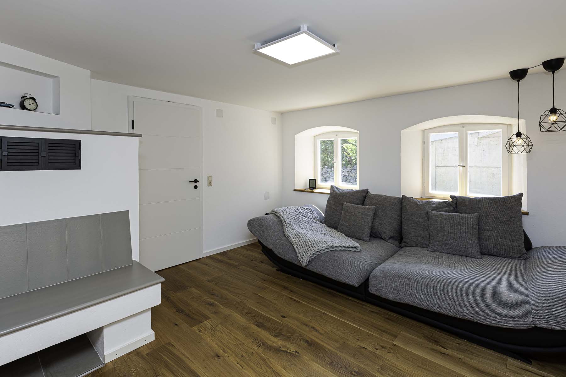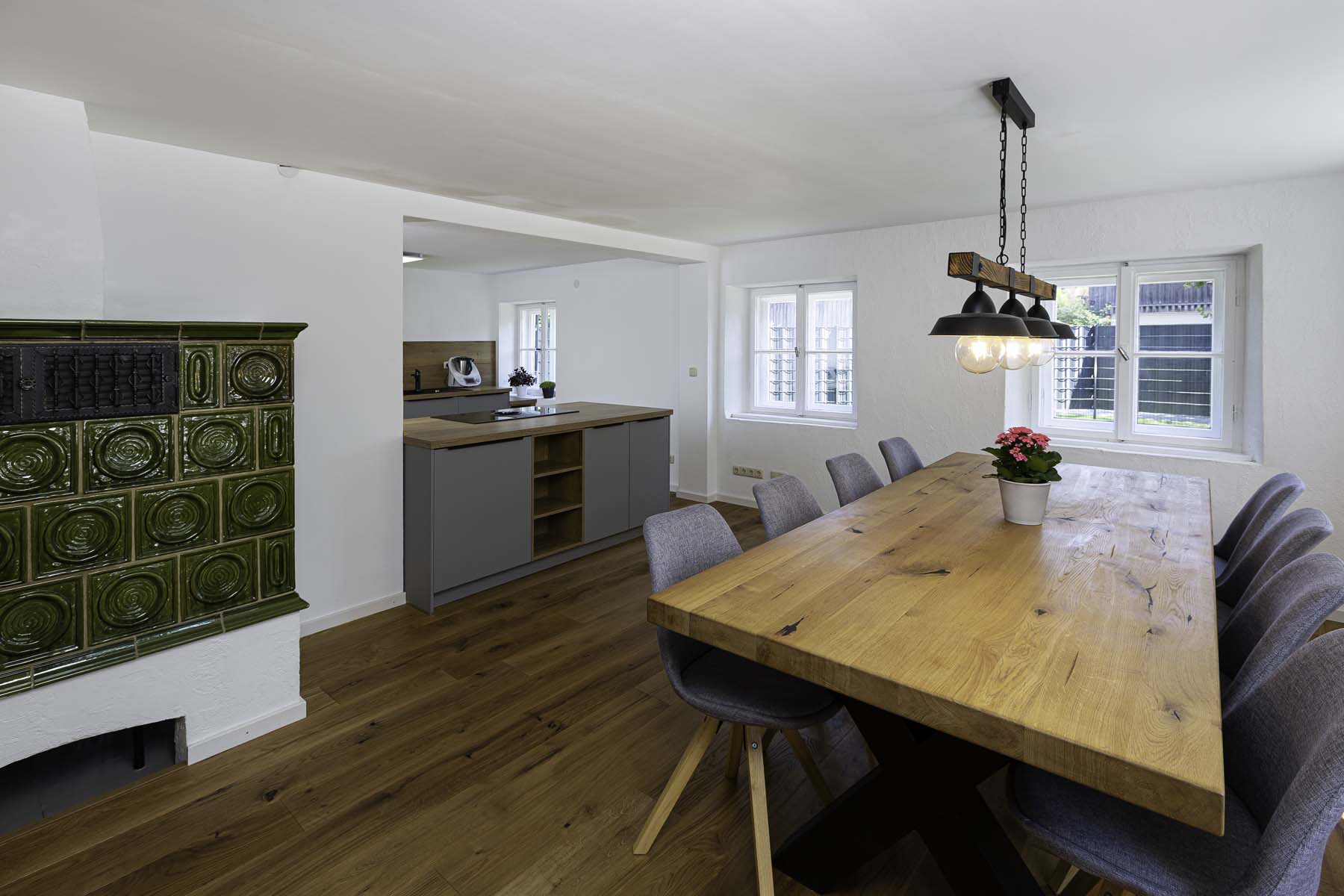Zusammen mit dem bestehenden Kachelofen und der modernen Einbauküche entstand ein stilvoller Mix aus Tradition und Moderne.