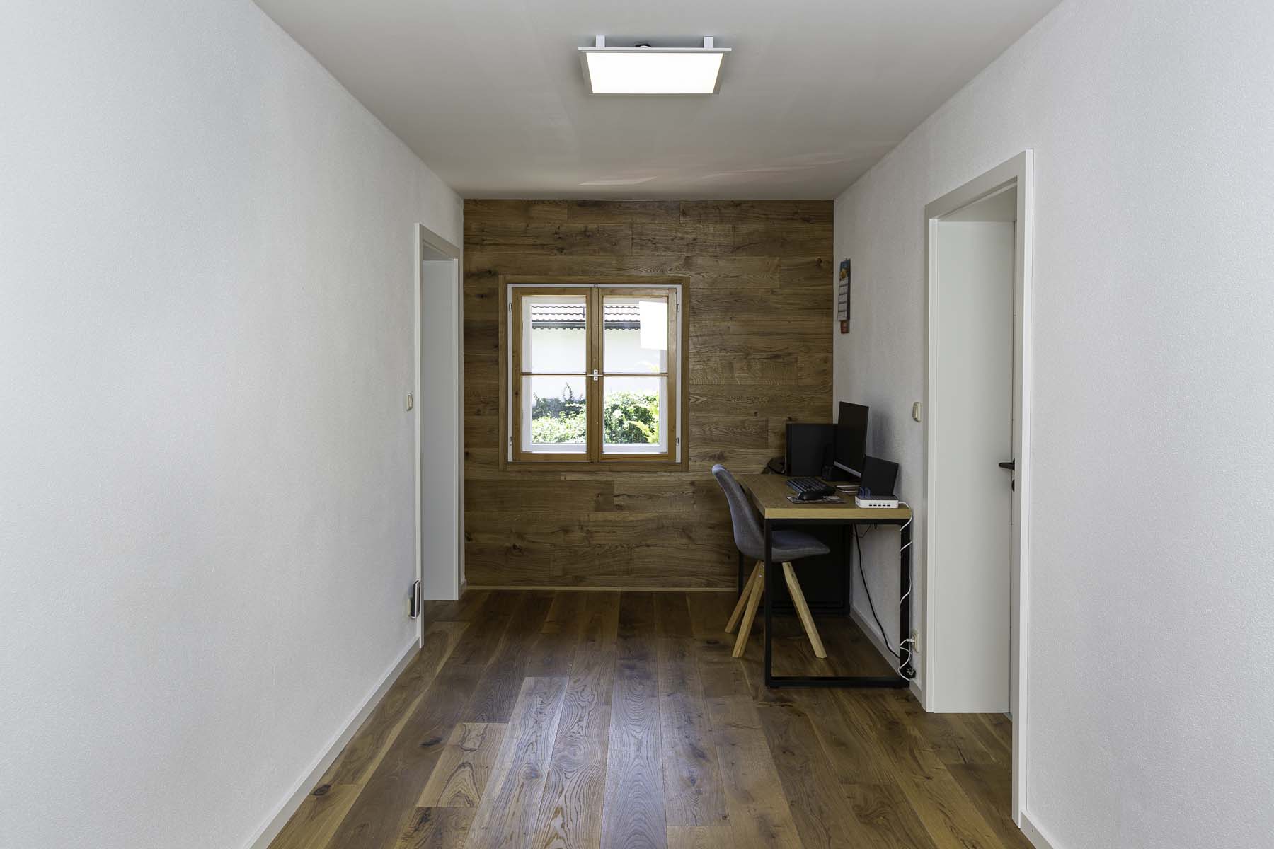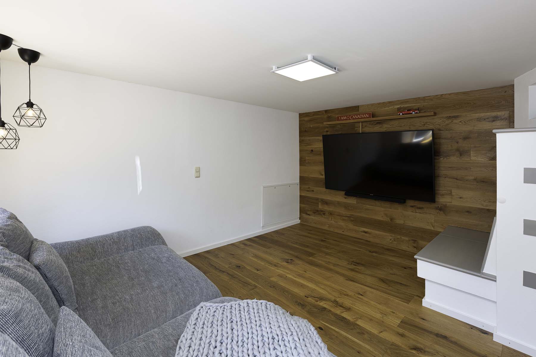 Ein Hingucker im Wohnzimmer ist definitiv die Wandverkleidung in Eiche Flowerie, welche auch beim Holzboden verwendet wurde.