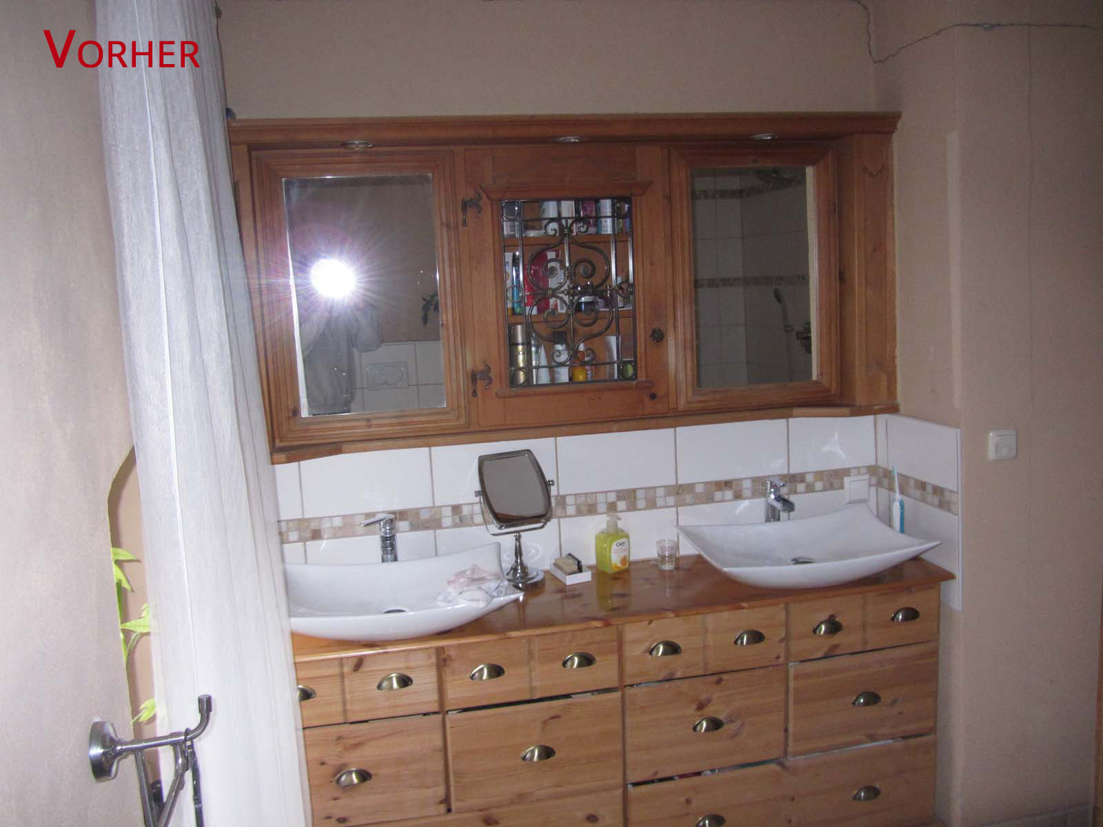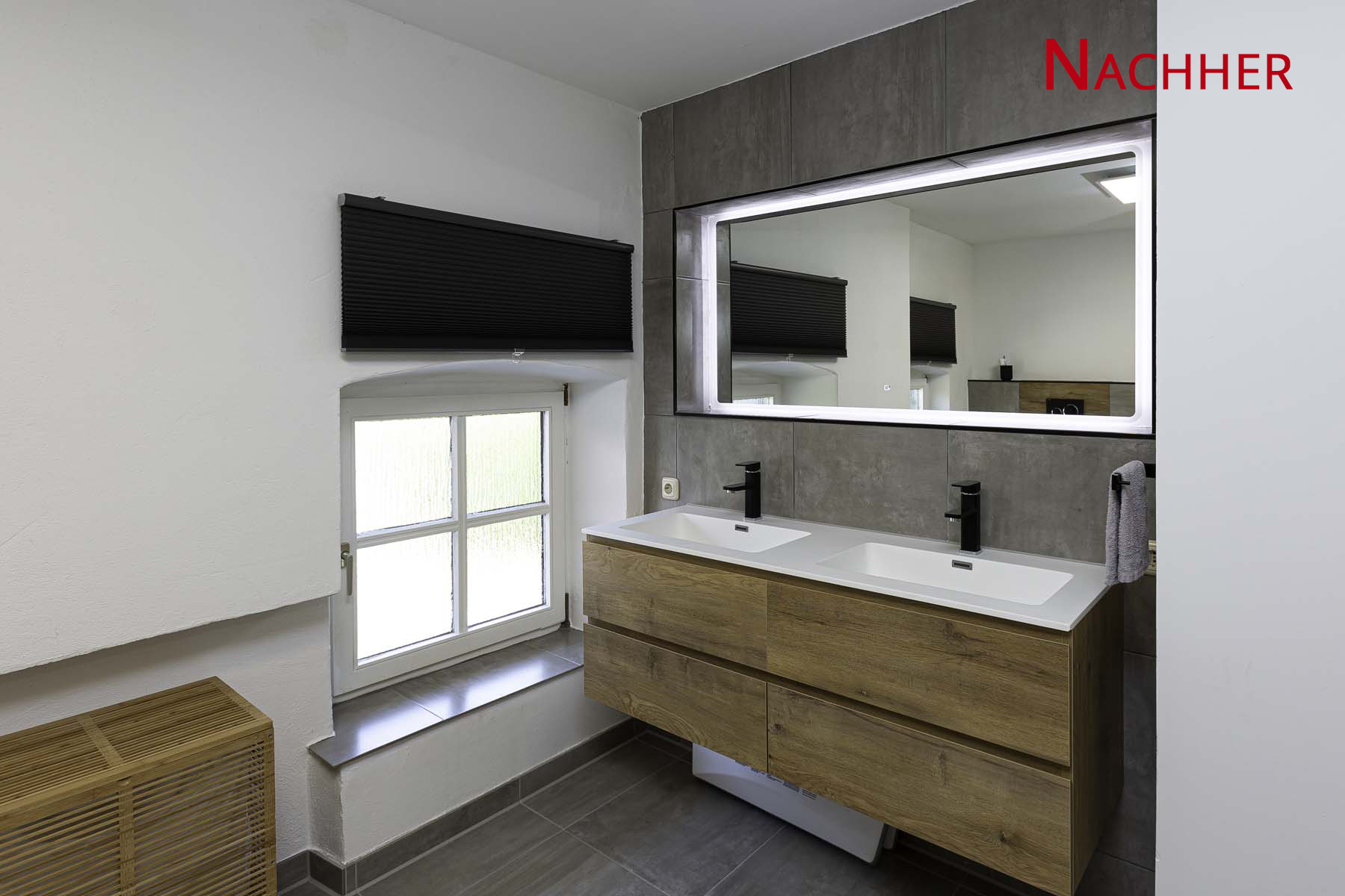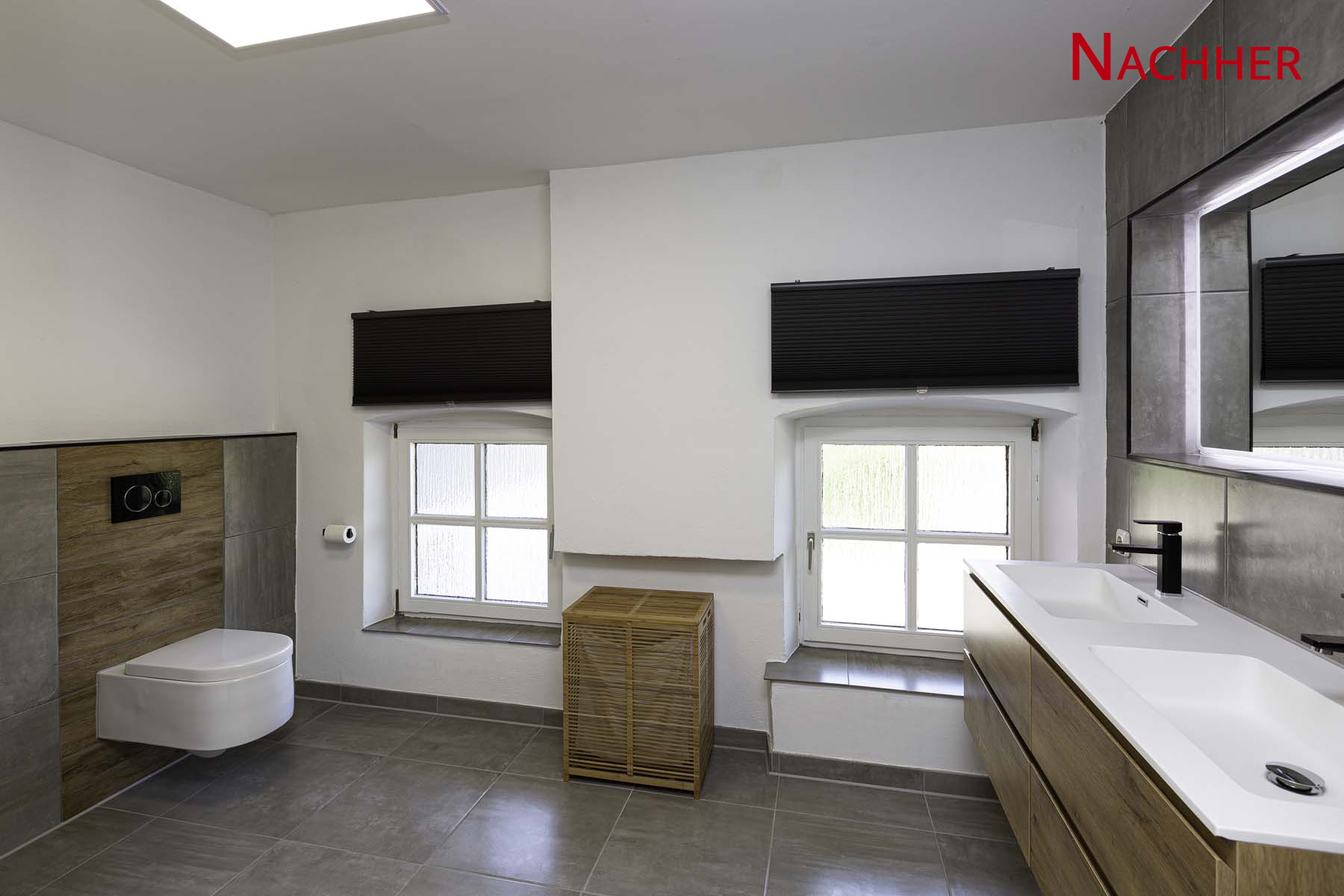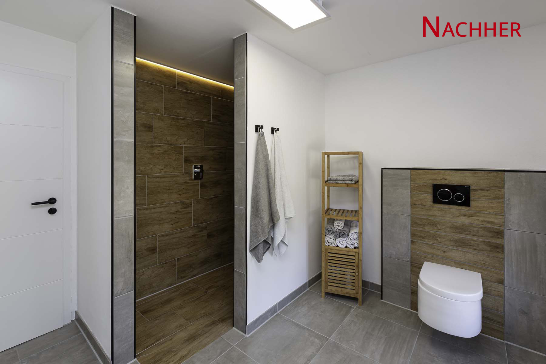 Der Wunsch der Bauherren war eine geräumige Dusche. Hierfür wurden neue Wände eingezogen. Bei der Gestaltung wurde auf die Kombination unterschiedlicher Fliesen gesetzt.