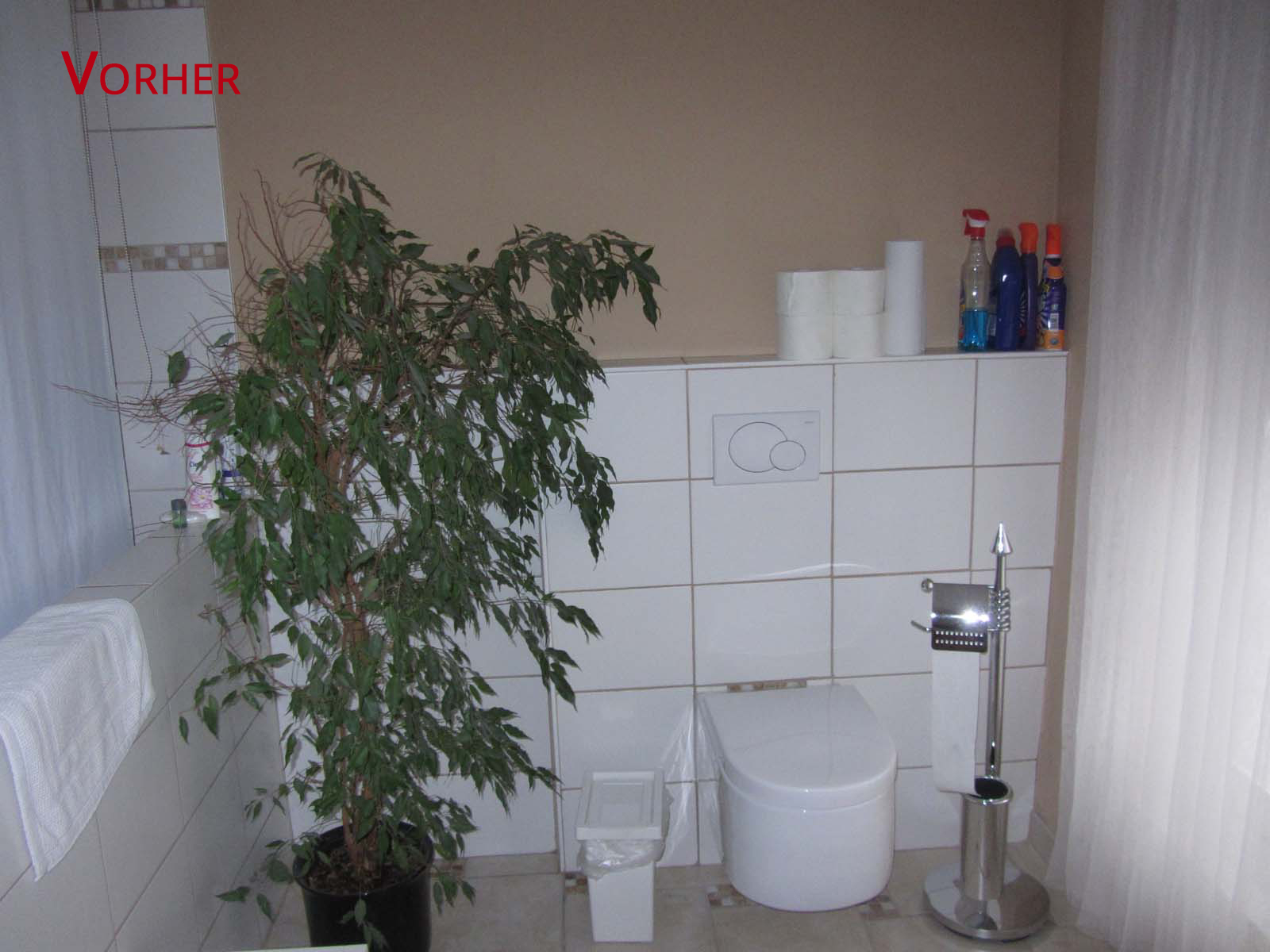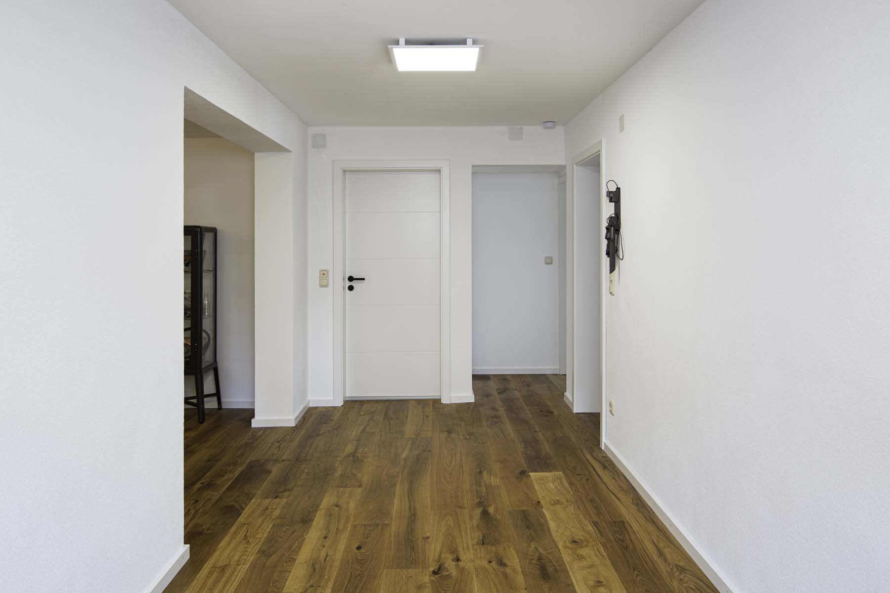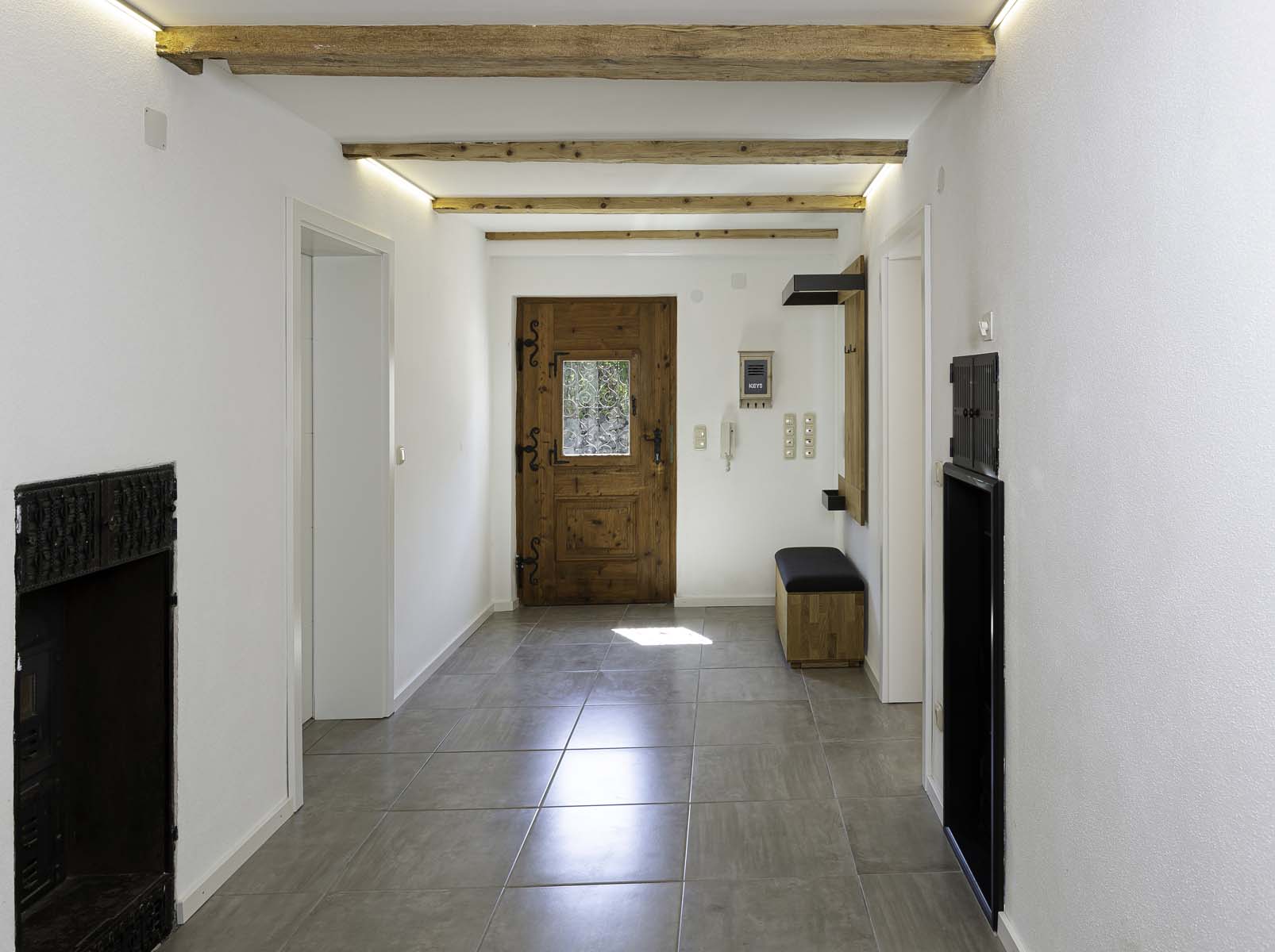 Der ehemals dunkle Eingangsbereich wirkt nun durch die Umbaumaßnahmen hell und freundlich. Die alte Deckenverkleidung wurde entfernt und neu mit Gipskarton verkleidet. Zusammen mit dem neuen Fliesenboden und der indirekten Deckenbeleuchtung ist ein lichtdurchfluteter Eingangsraum entstanden.