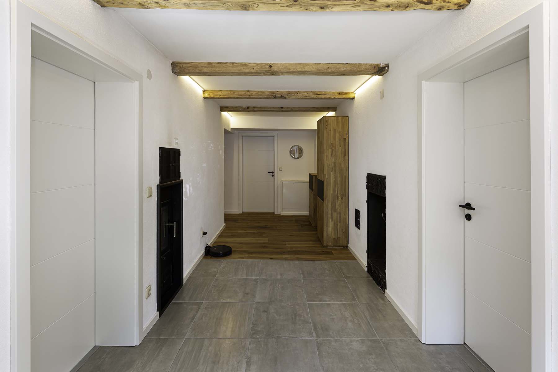 Die Bauherren wünschten sich außerdem einen zusätzlichen Kachelofen, welcher vom Flur aus befeuert werden kann.