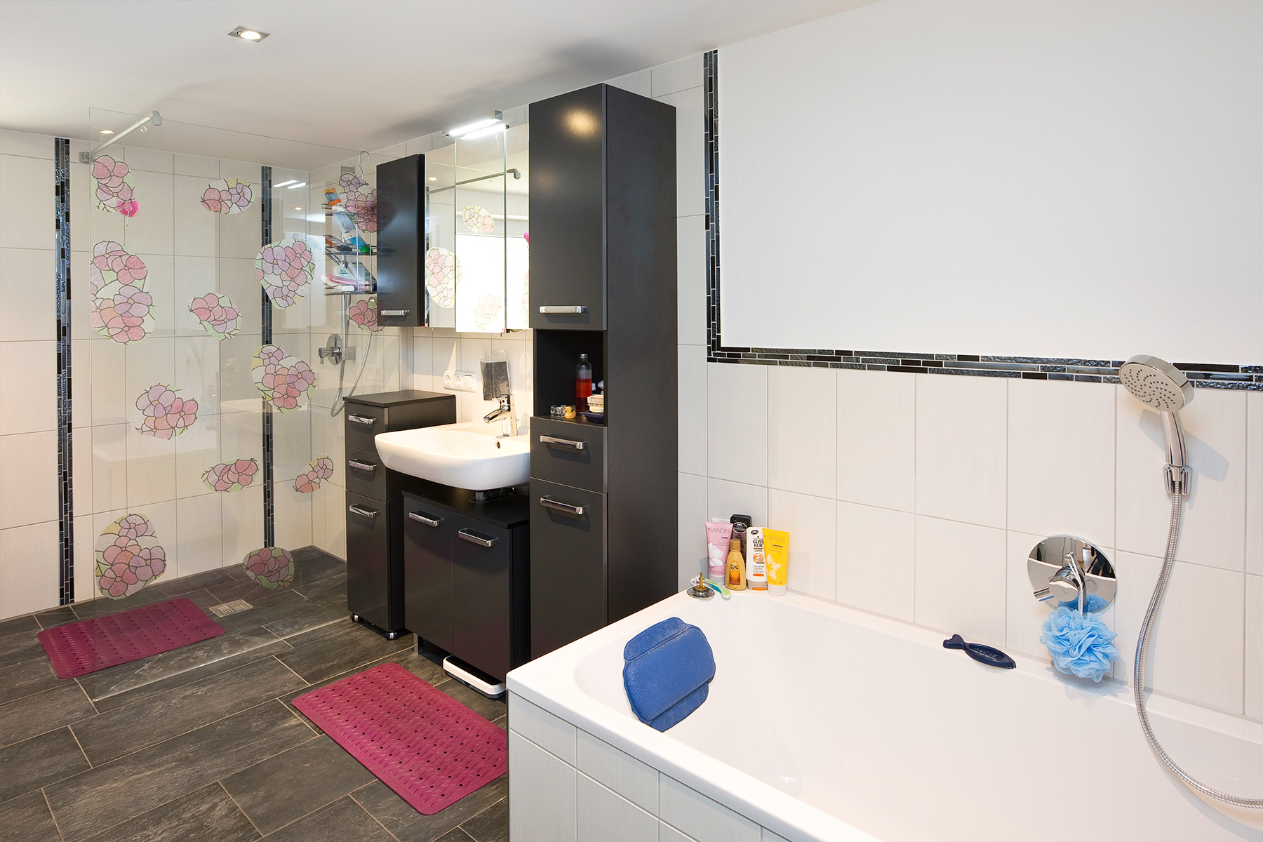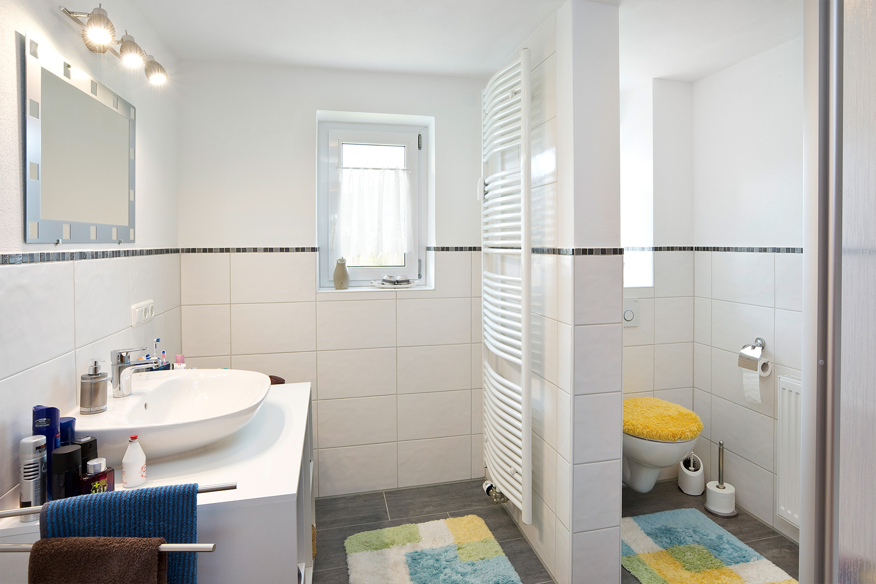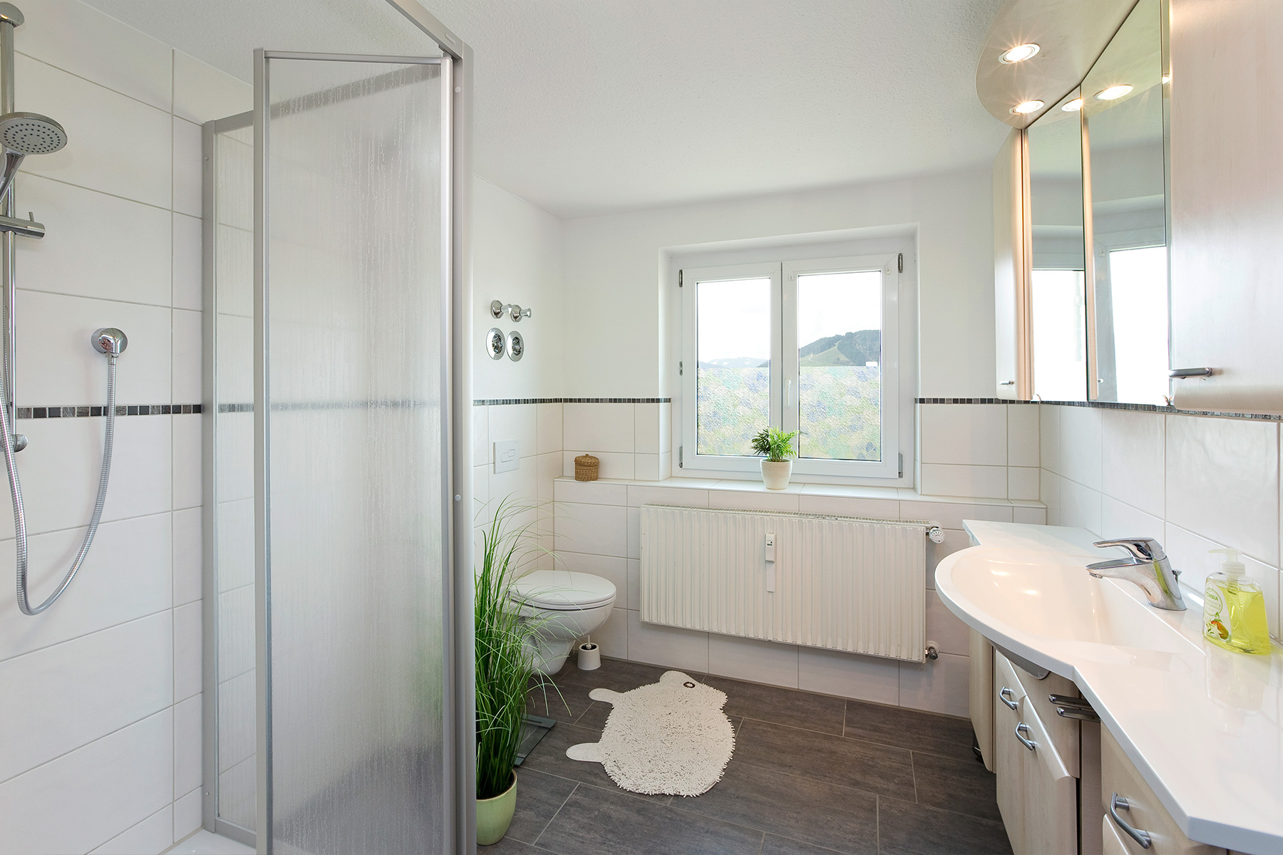 Auch das Badezimmer ist eingetaucht in eine facettenreiche Gestaltung. Anthrazitfarbene Möbel und Elemente in Kombination mit einer zeitlosen Sanitärausstattung lassen das Bad so zu einem Wohlfühlraum der Extraklasse werden.