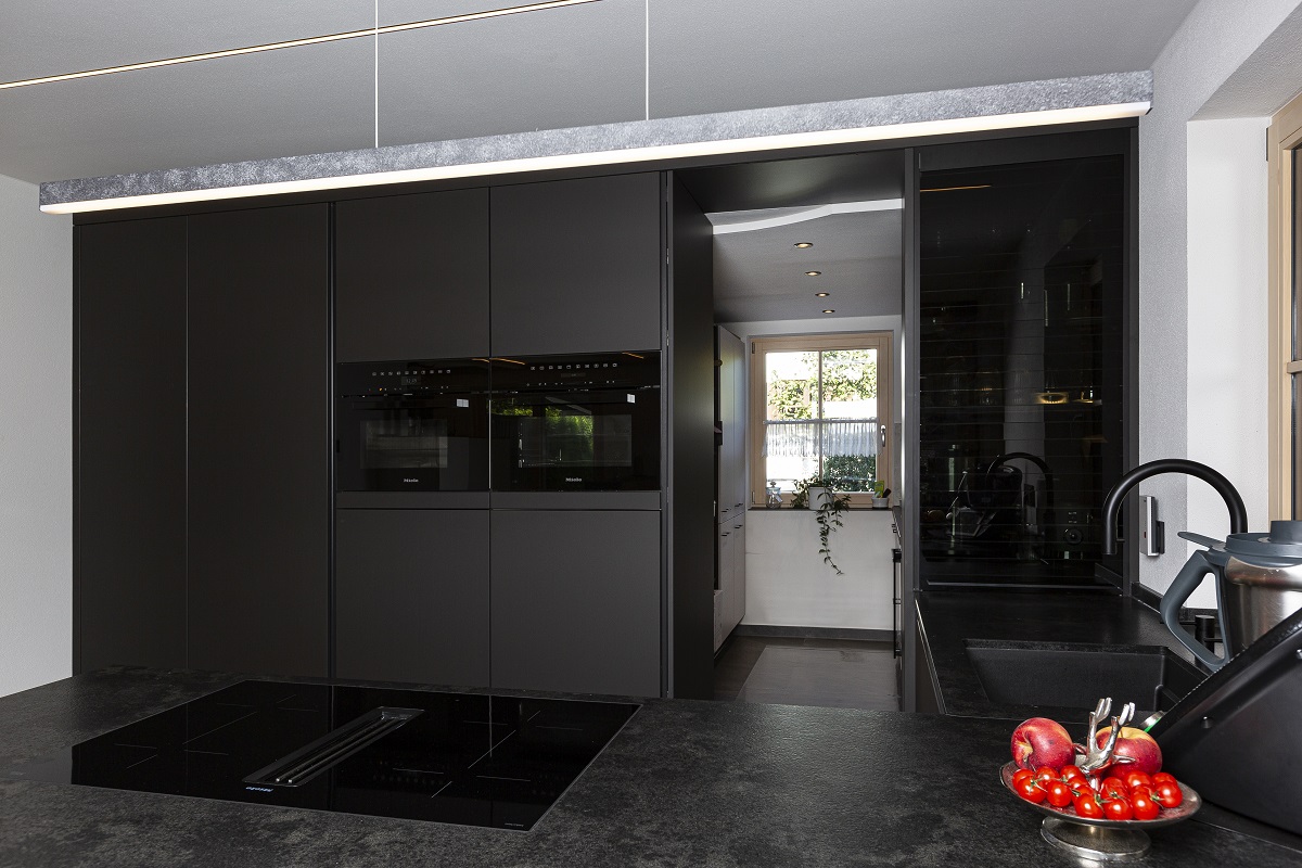 - Küche in lavaschwarz matt mit Polymerglas-Fronten made in Germany – Geplant und eingebaut by Hauser