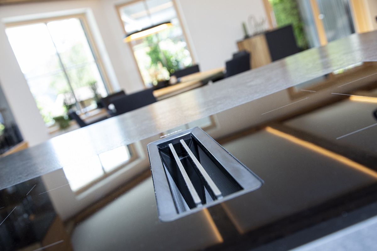 - Details wie Quooker, Jalousien in Schwarzglas und beleuchteter Sockel