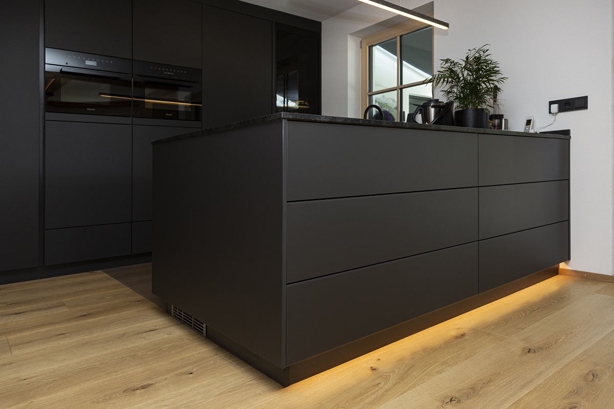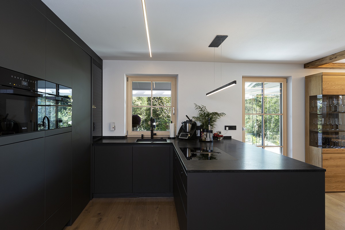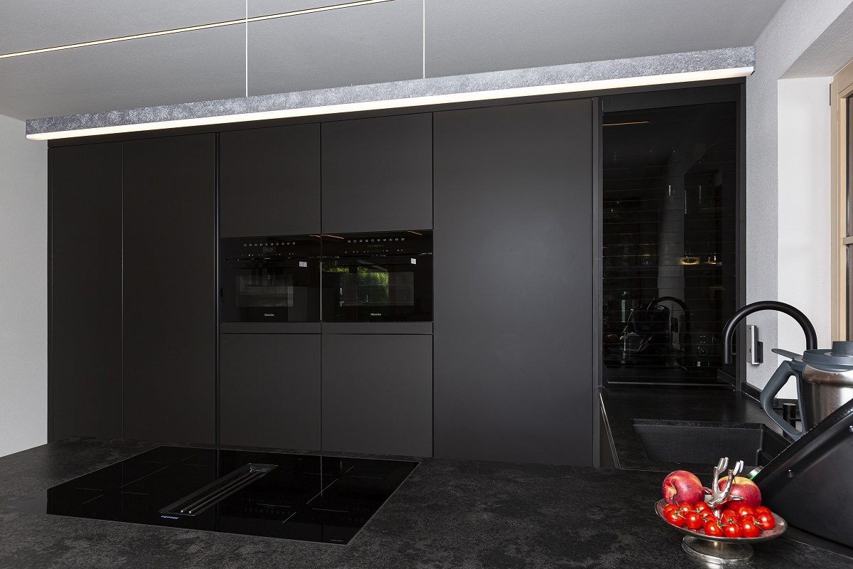 - Küche in lavaschwarz matt mit Polymerglas-Fronten made in Germany – Geplant und eingebaut by Hauser