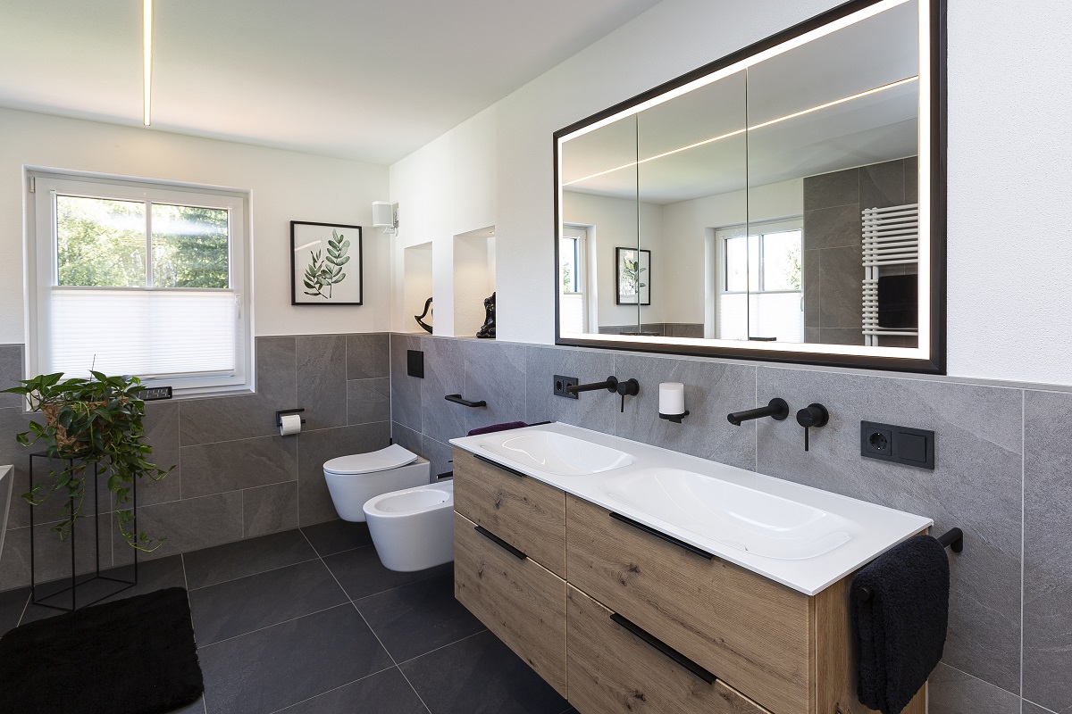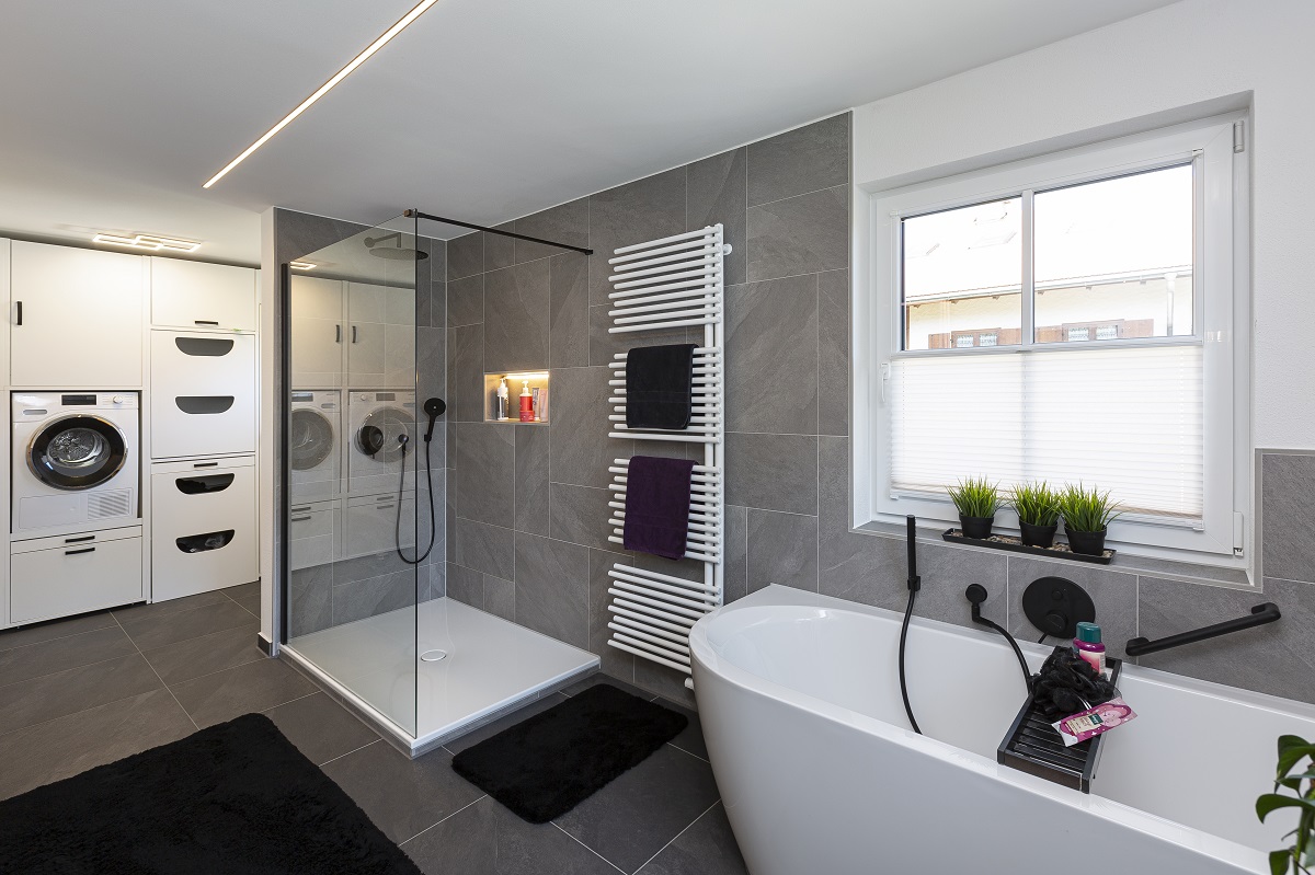 - Offenes Raumkonzept mit bodengleicher Dusche und freistehender Wanne