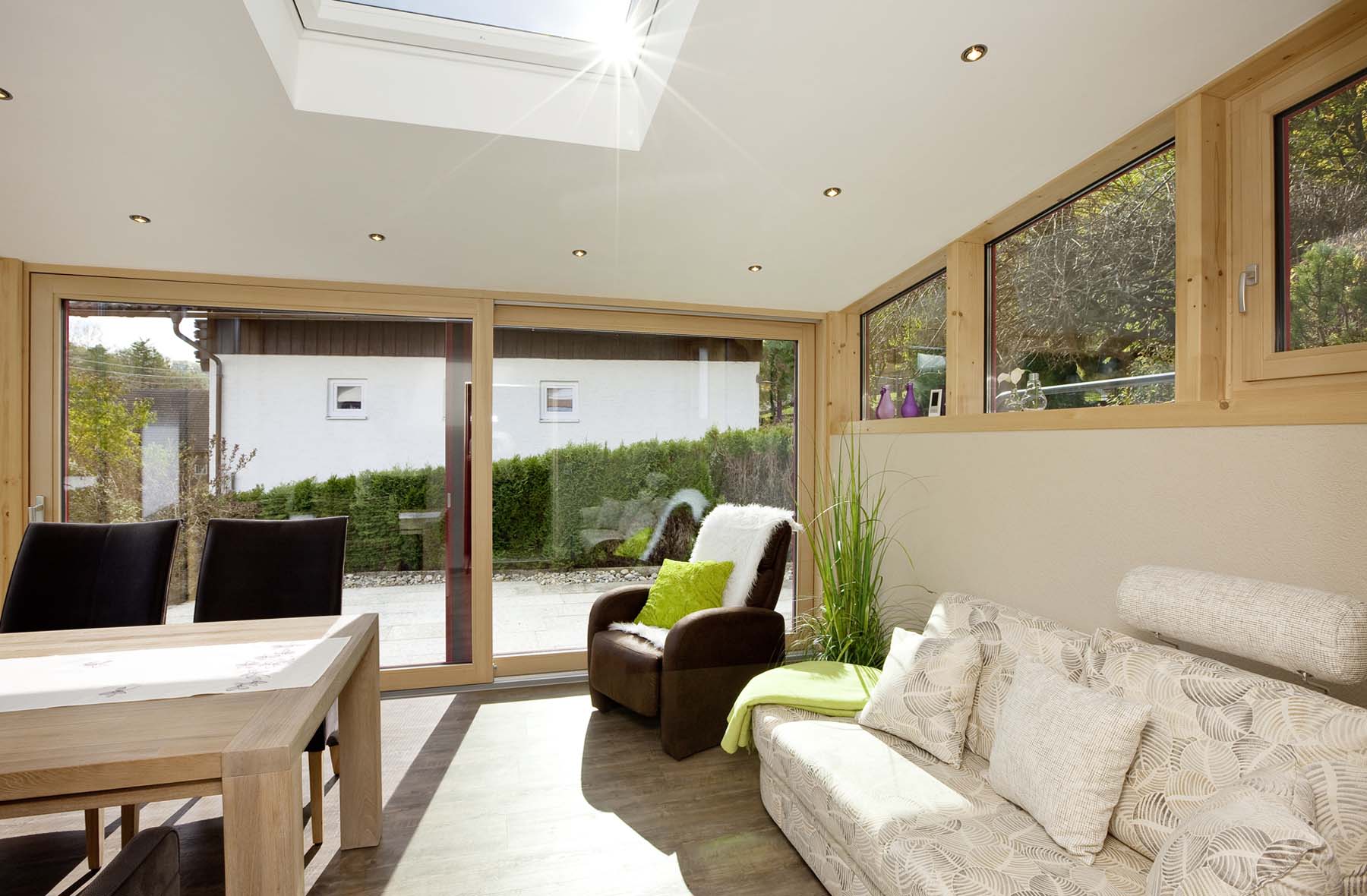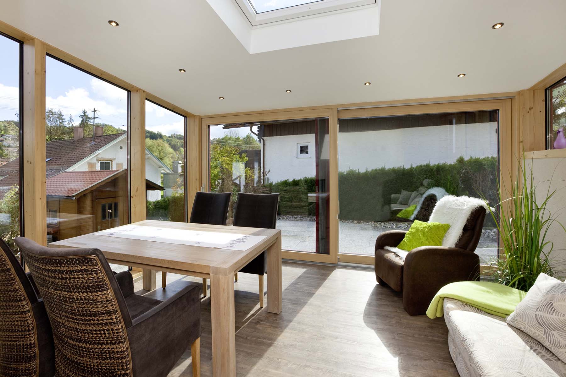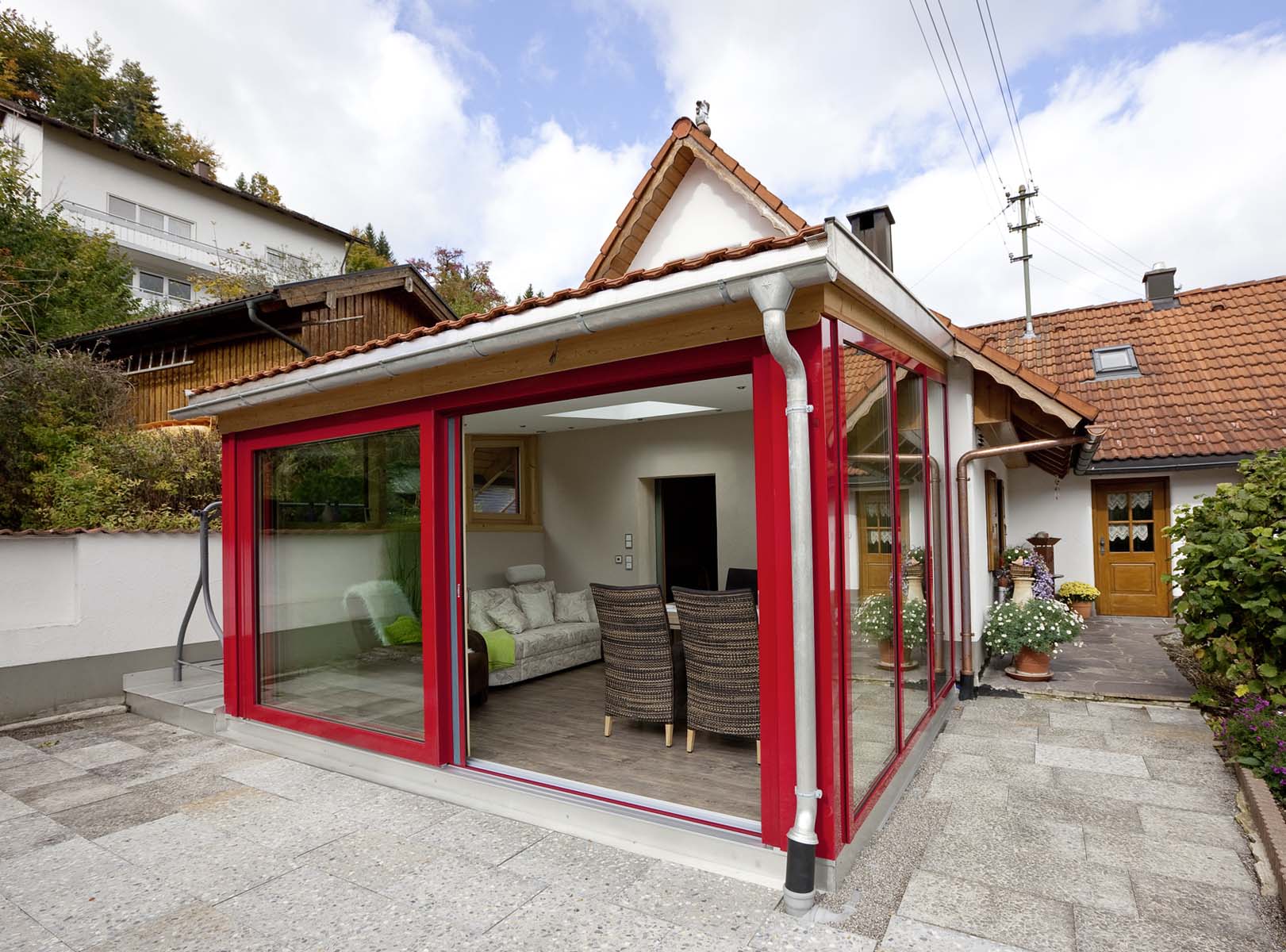 Wo früher eine Markise Schutz vor Sonne und Regen bot, ist heute ein moderner Wintergarten entstanden. Die roten Fensterelemente aus Holz-Alu lassen sich weit öffnen. Dabei verschwinden die Grenzen zwischen drinnen und draußen. Der hochwertige Bodenbelag sowie ein Fenster im Dach des Wintergartens sorgen für eine stilvolle Atmosphäre und laden zum Verweilen ein.